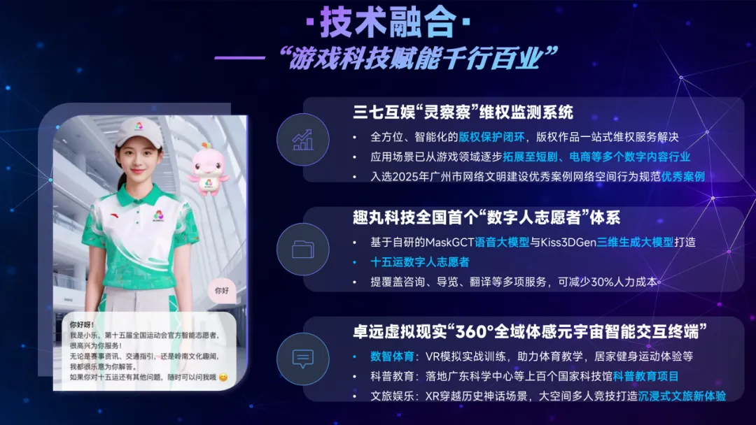 广州游戏产业的实时渲染、AI等技术向数字文保、工业仿真等领域外溢:网易荣获中国图象图形学学会“科技进步”一等奖;三七互娱“小七”大模型实现2D美术AI生成占比超80%,AI翻译覆盖85%出海产品;贪玩游戏自研系统实现研运全链路智能升级,案例入选数产融合典型案例。同时,中小微企业研发多款环保、航天科普等公益游戏,以轻量化形式传播社会议题。