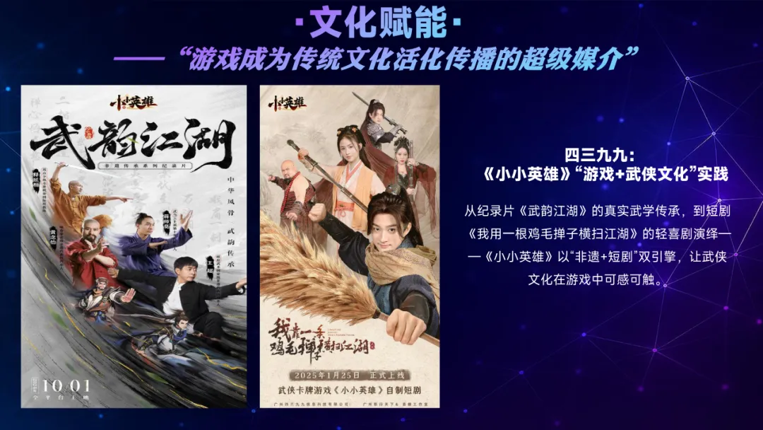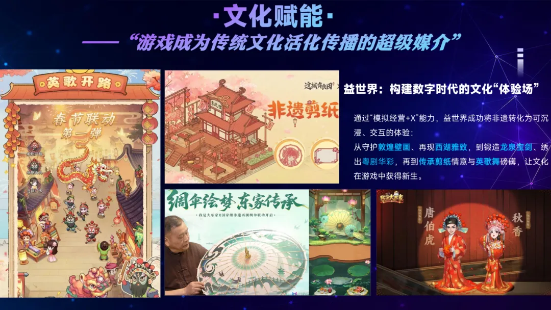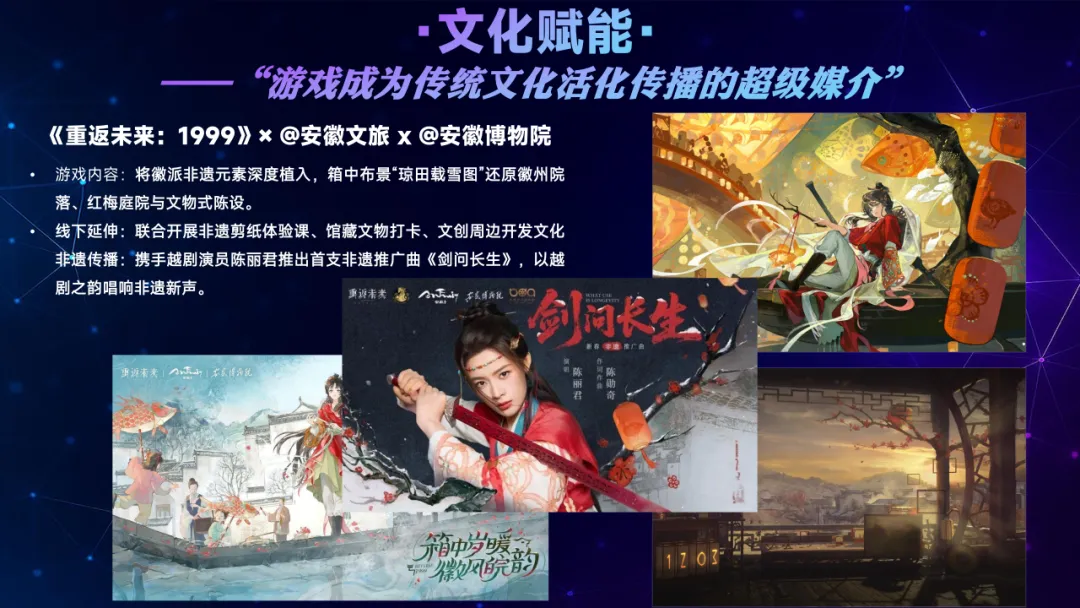 企业以游戏为载体活化非遗,打造线上植入、线下互动的传播模式:三七互娱打造《时光大爆炸》“皖韵商潮”、《寻道大千》数字黄山等内容,让玩家在游戏中读懂中国山河与人文;益世界以“模拟经营+X”模式,将敦煌壁画、龙泉宝剑、粤剧华彩、英歌舞等非遗元素融入游戏,构建数字文化体验场;四三九九《小小英雄》联动纪录片《武韵江湖》、自制武侠短剧,以“非遗+短剧”双引擎传承武侠文化;《重返未来:1999》携手安徽文旅、安徽博物院,植入徽派非遗元素,联合越剧演员推出非遗推广曲,实现“游戏+非遗+文旅”深度融合。
