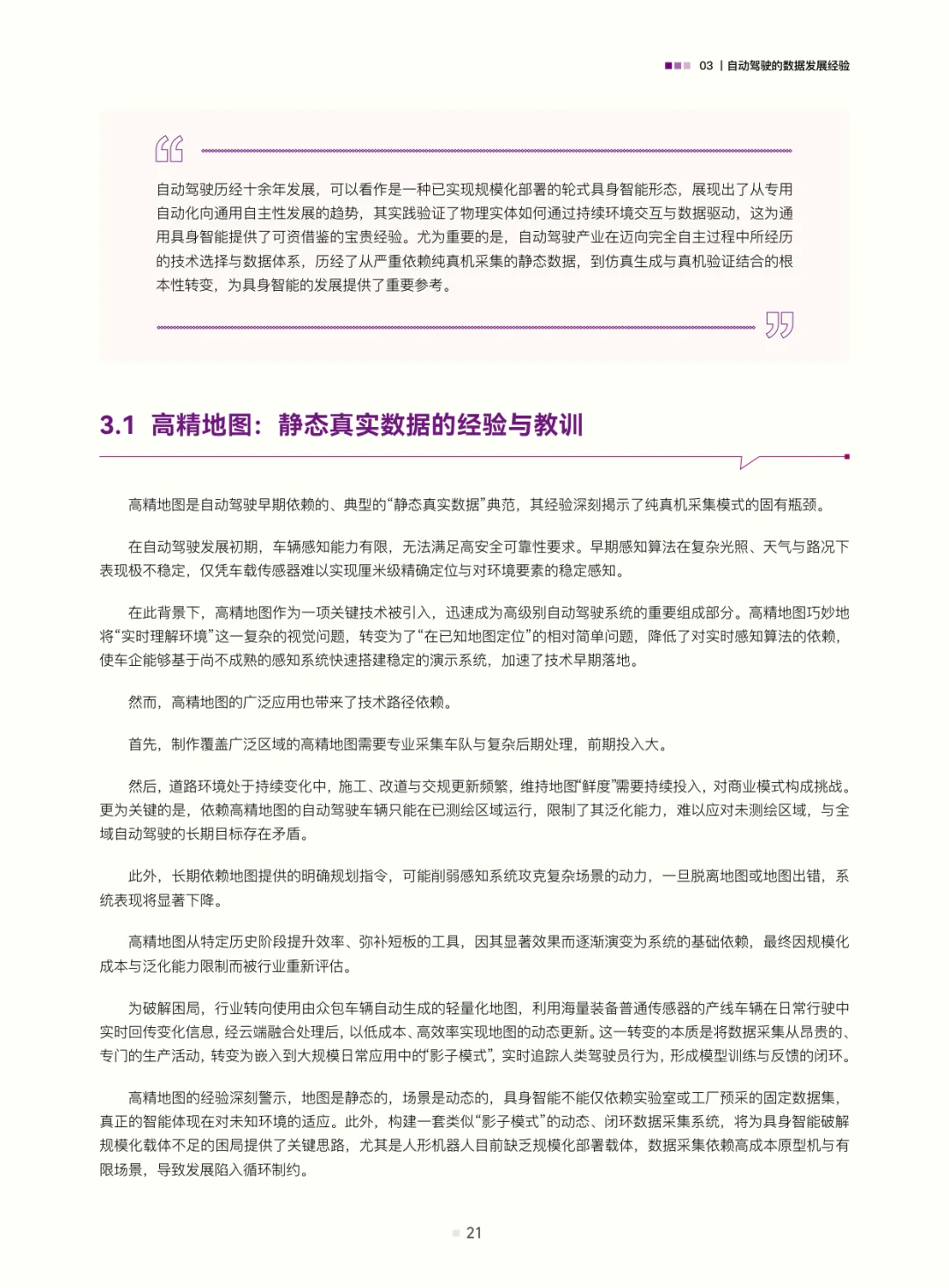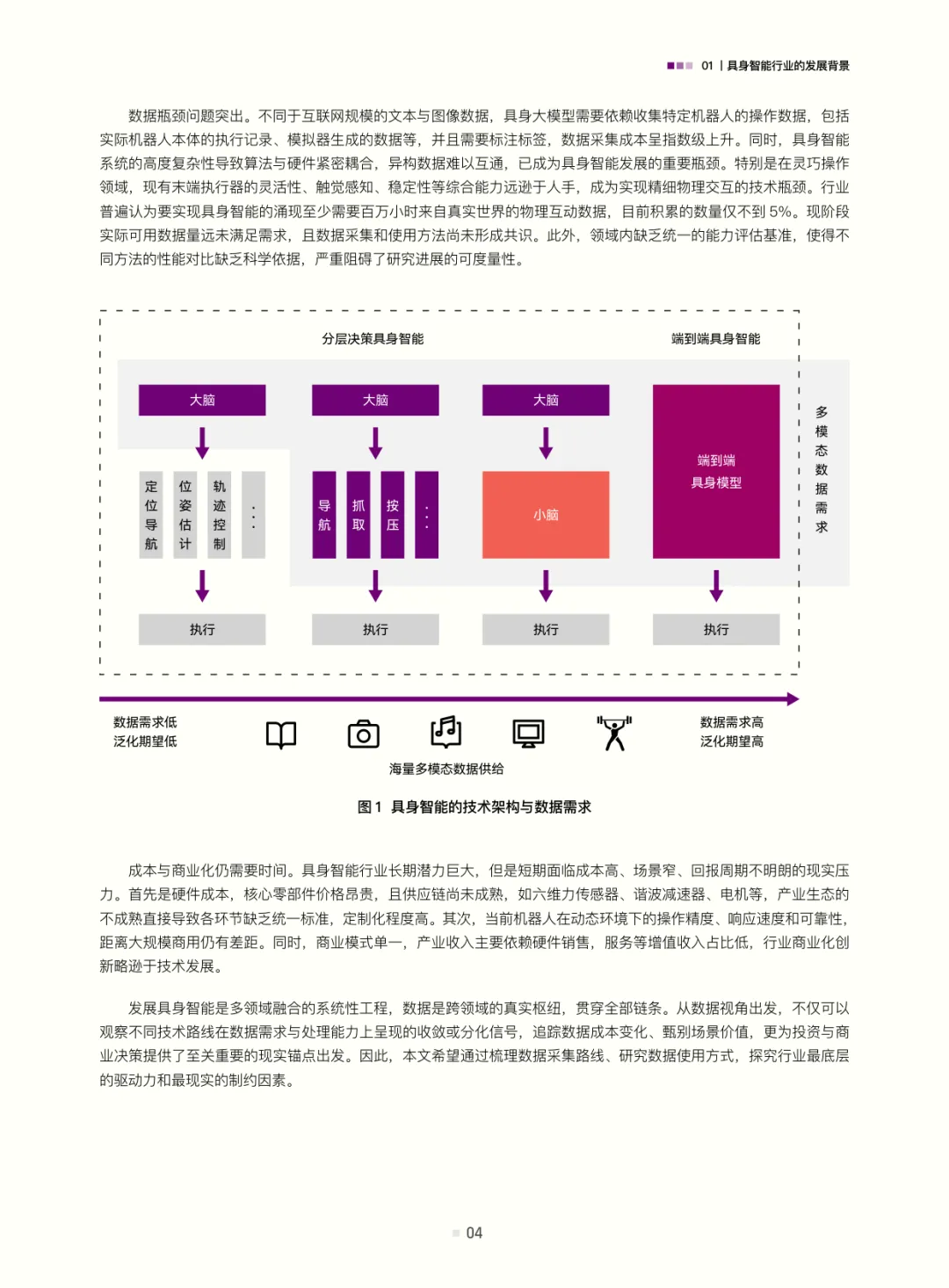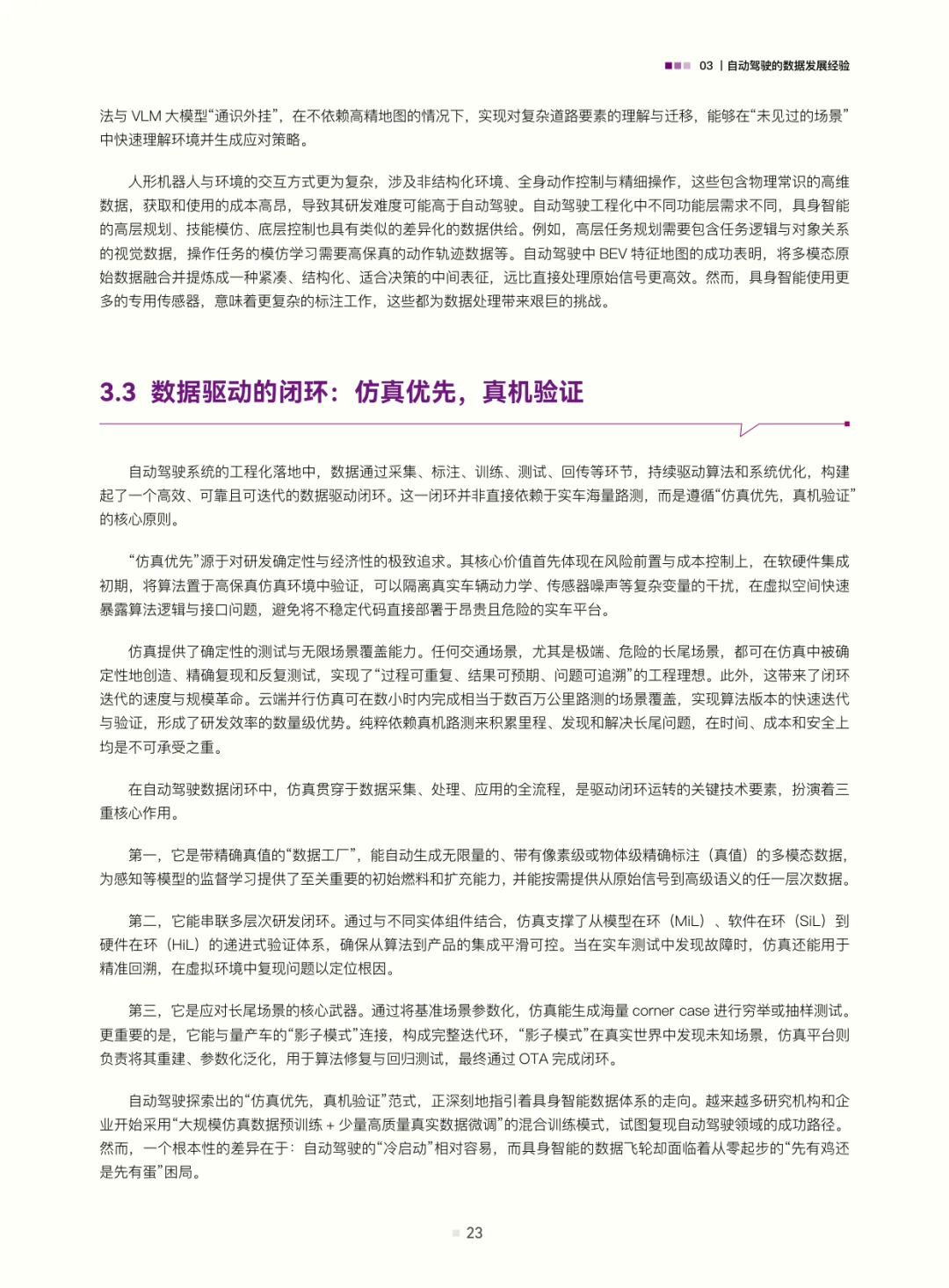 在此基础上,白皮书从数据视角推演渐进式商业化道路:第一阶段以少量数据构建原型与工程环境执行能力(聚焦可控场景验证技术可行性);第二阶段聚焦场景、以大量数据驱动算法迭代与标准化(需政府与企业共建训练场,破解数据孤岛与标准缺失);第三阶段靠海量数据实现高阶功能闭环拓展(依托“云-边-端”协同,走向“智能即服务”模式)。