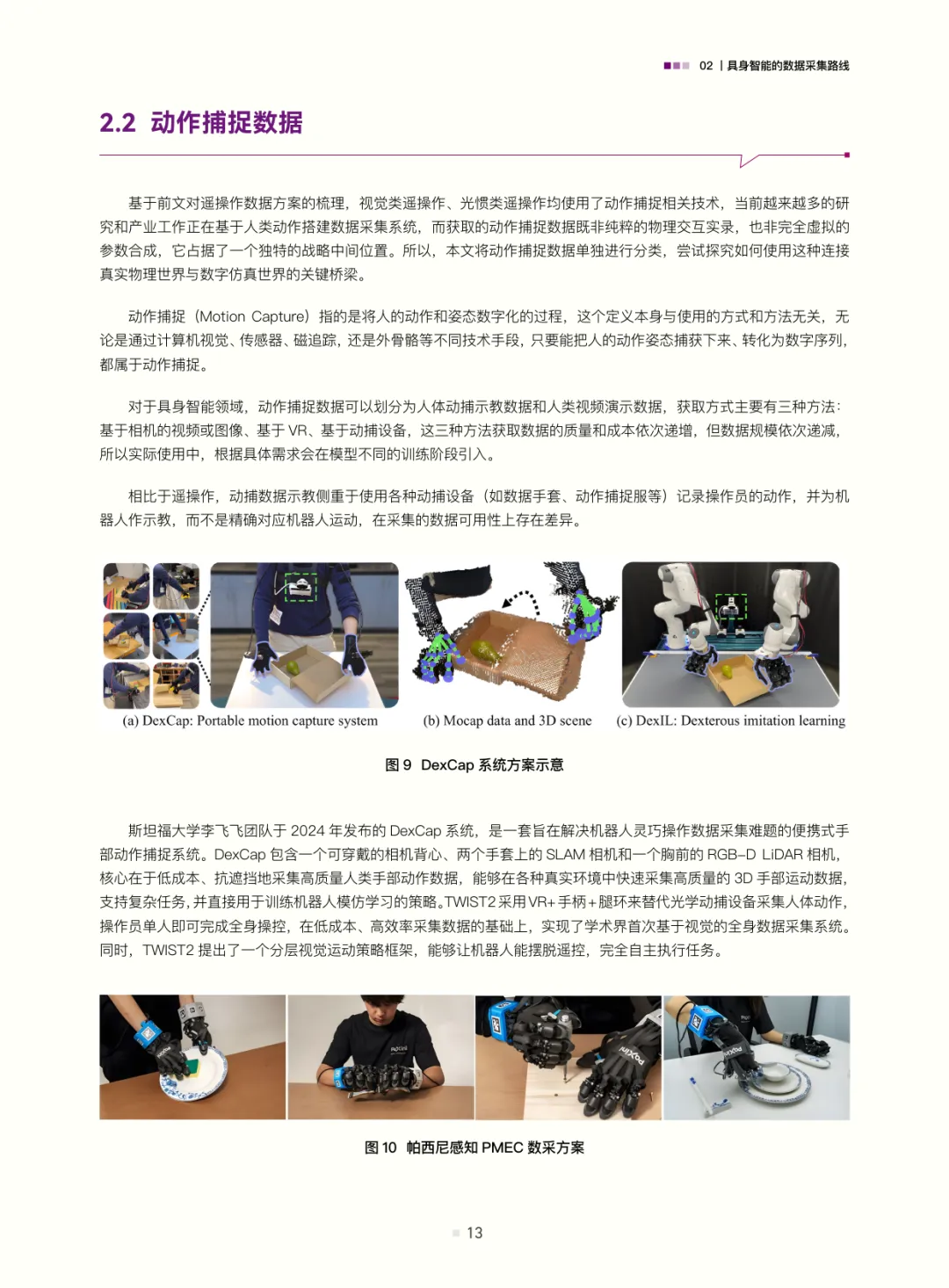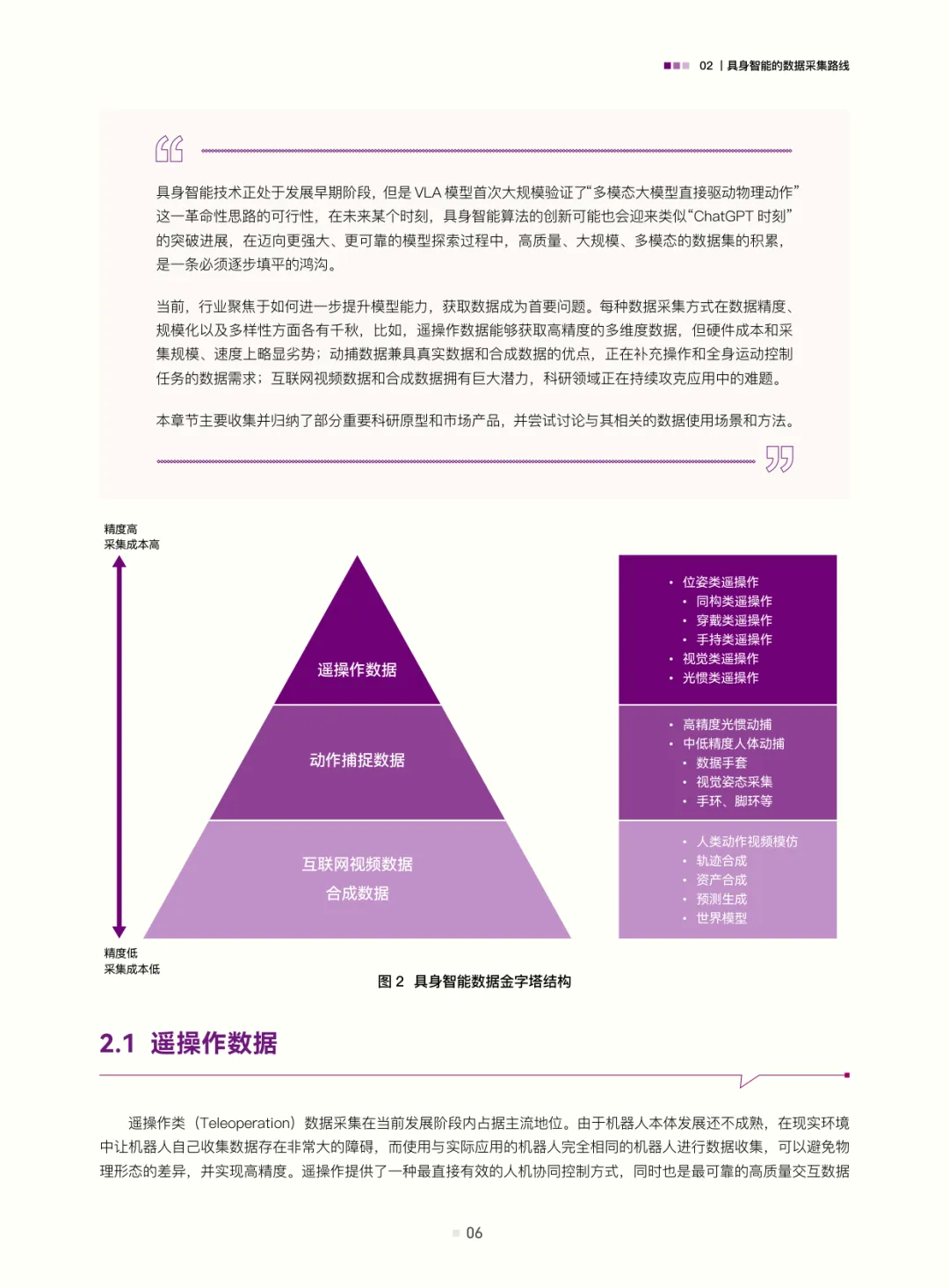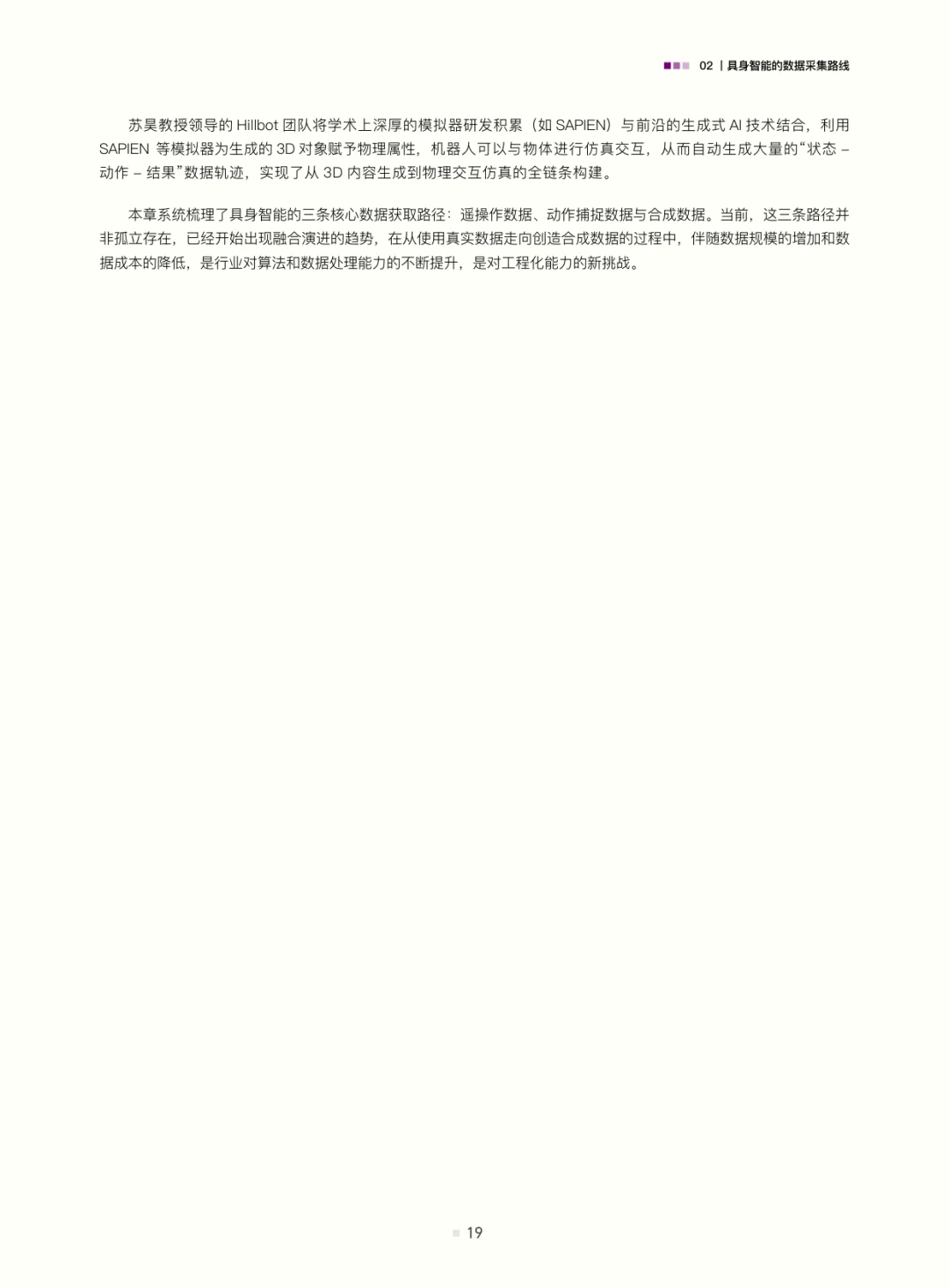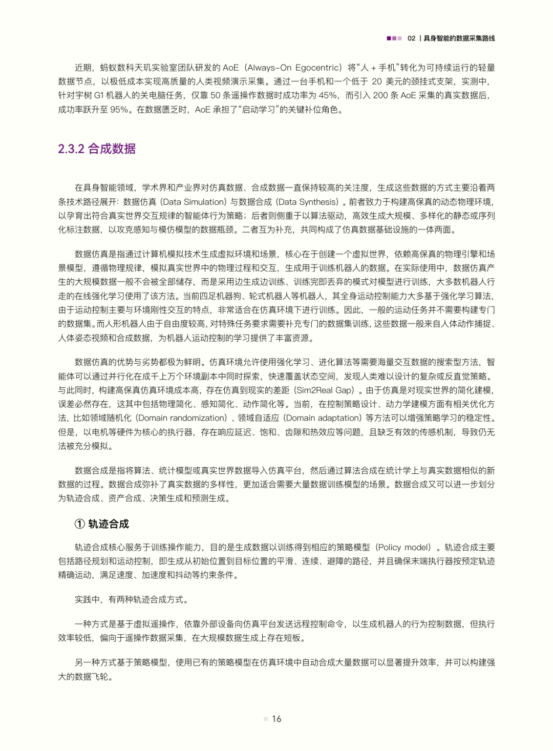 白皮书梳理了具身智能的数据采集路线:遥操作数据(含位姿类、视觉类、光惯类,是当前高质量交互数据的主流来源)、动作捕捉数据(连接真实与数字仿真的关键桥梁)、互联网视频与合成数据(潜力大但需攻克应用难题);结合自动驾驶数据发展经验(从依赖高精地图的静态数据到仿真与真机融合的动态体系,揭示“仿真优先、真机验证”及数据异构融合的重要性),评估了具身智能数据发展现状——真机遥操作数据是“黄金标准”但泛化与规模受限,无本体数据采集(如UMI、轻量化动作捕捉、人类视频)可破“成本-规模-多样性”三角,仿真系统是必要非完美工具(需解决Sim2Real gap与复杂交互模拟难题)。