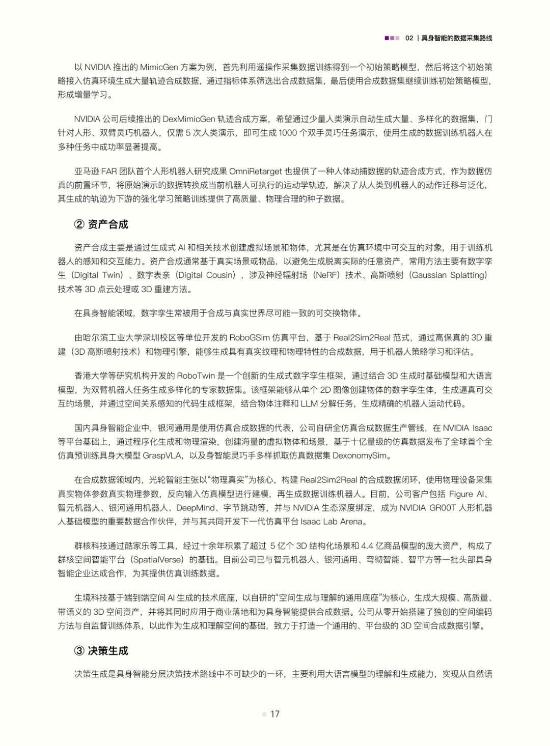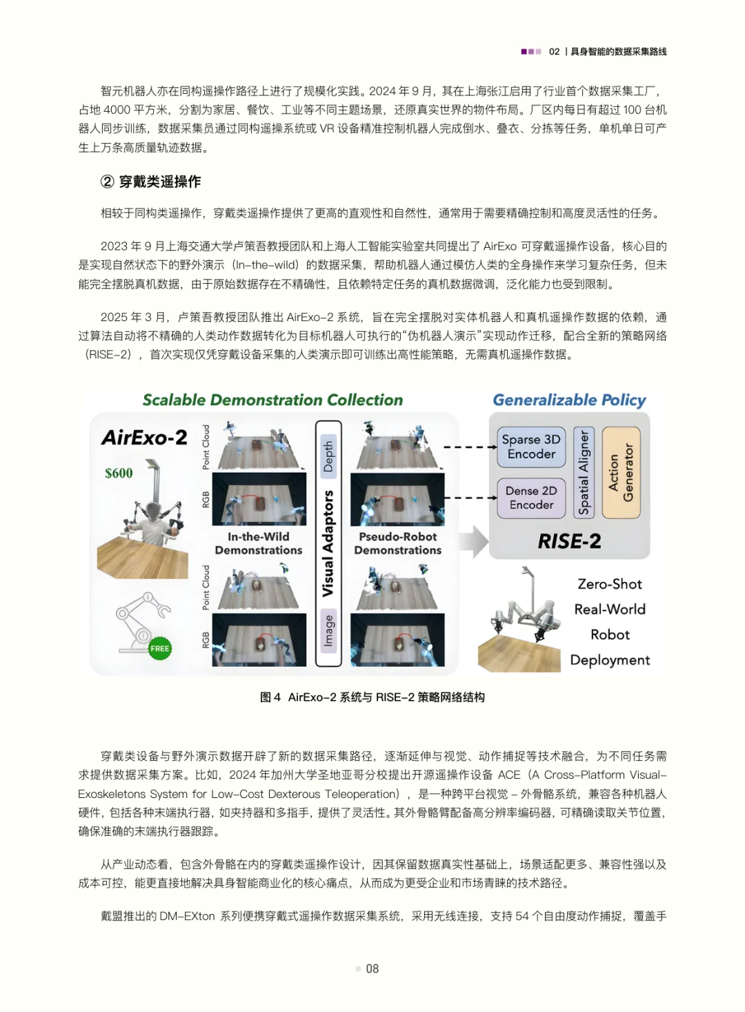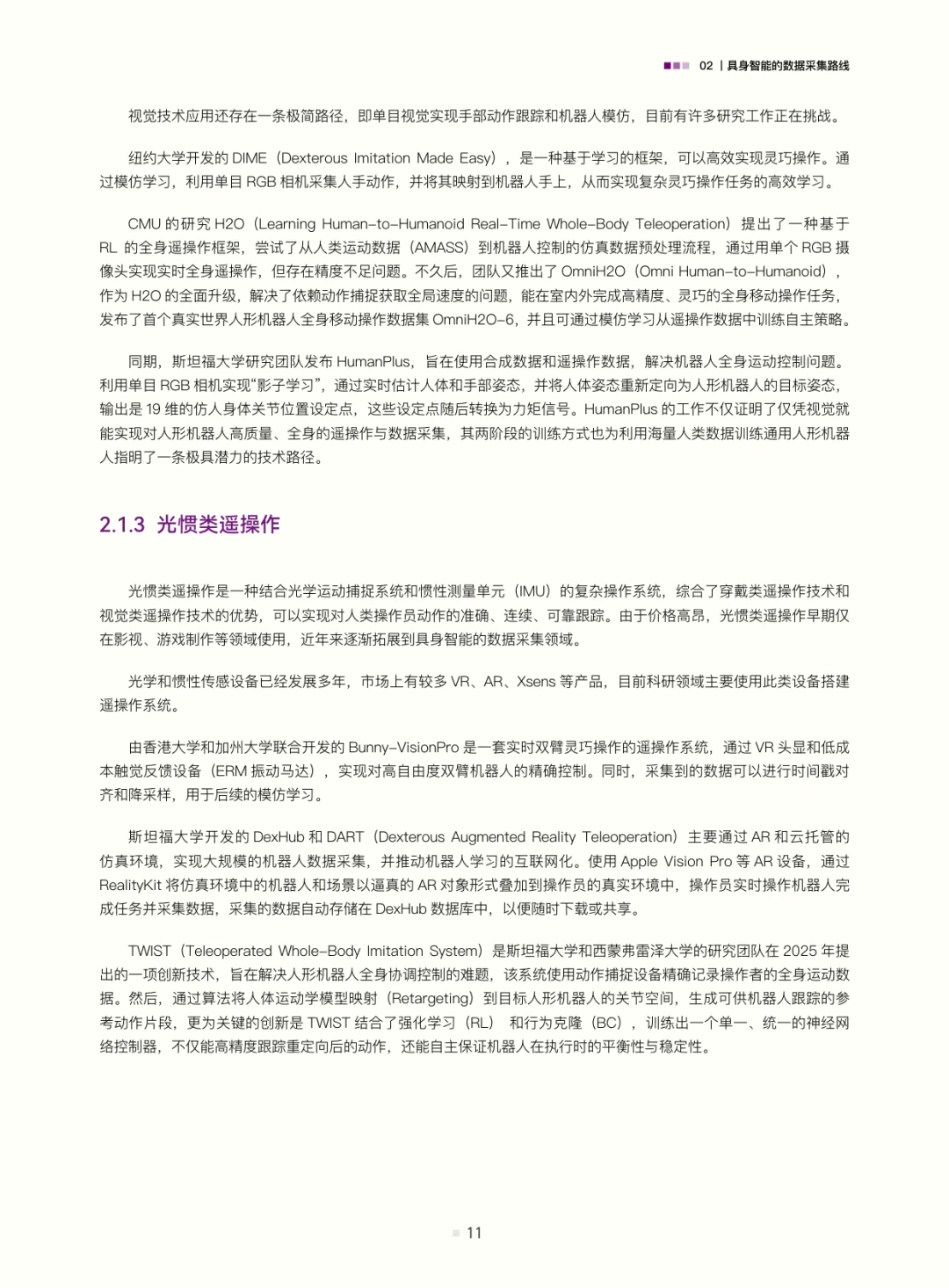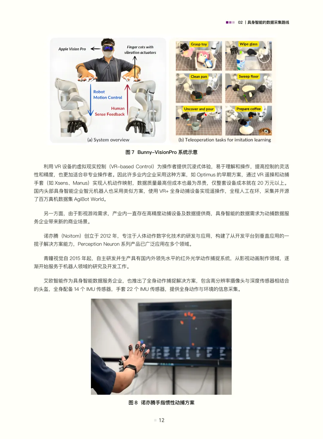 白皮书梳理了具身智能的数据采集路线:遥操作数据(含位姿类、视觉类、光惯类,是当前高质量交互数据的主流来源)、动作捕捉数据(连接真实与数字仿真的关键桥梁)、互联网视频与合成数据(潜力大但需攻克应用难题);结合自动驾驶数据发展经验(从依赖高精地图的静态数据到仿真与真机融合的动态体系,揭示“仿真优先、真机验证”及数据异构融合的重要性),评估了具身智能数据发展现状——真机遥操作数据是“黄金标准”但泛化与规模受限,无本体数据采集(如UMI、轻量化动作捕捉、人类视频)可破“成本-规模-多样性”三角,仿真系统是必要非完美工具(需解决Sim2Real gap与复杂交互模拟难题)。