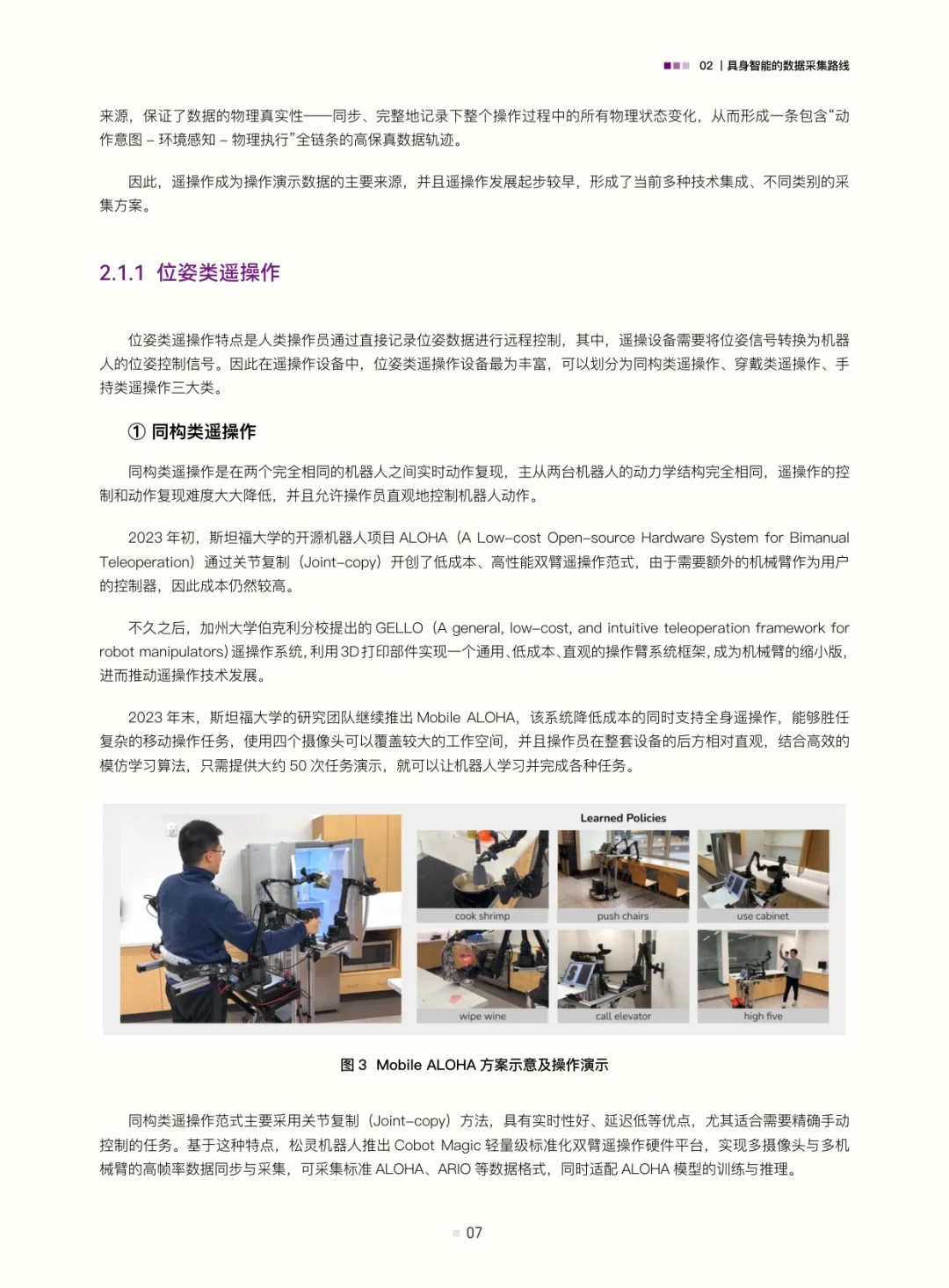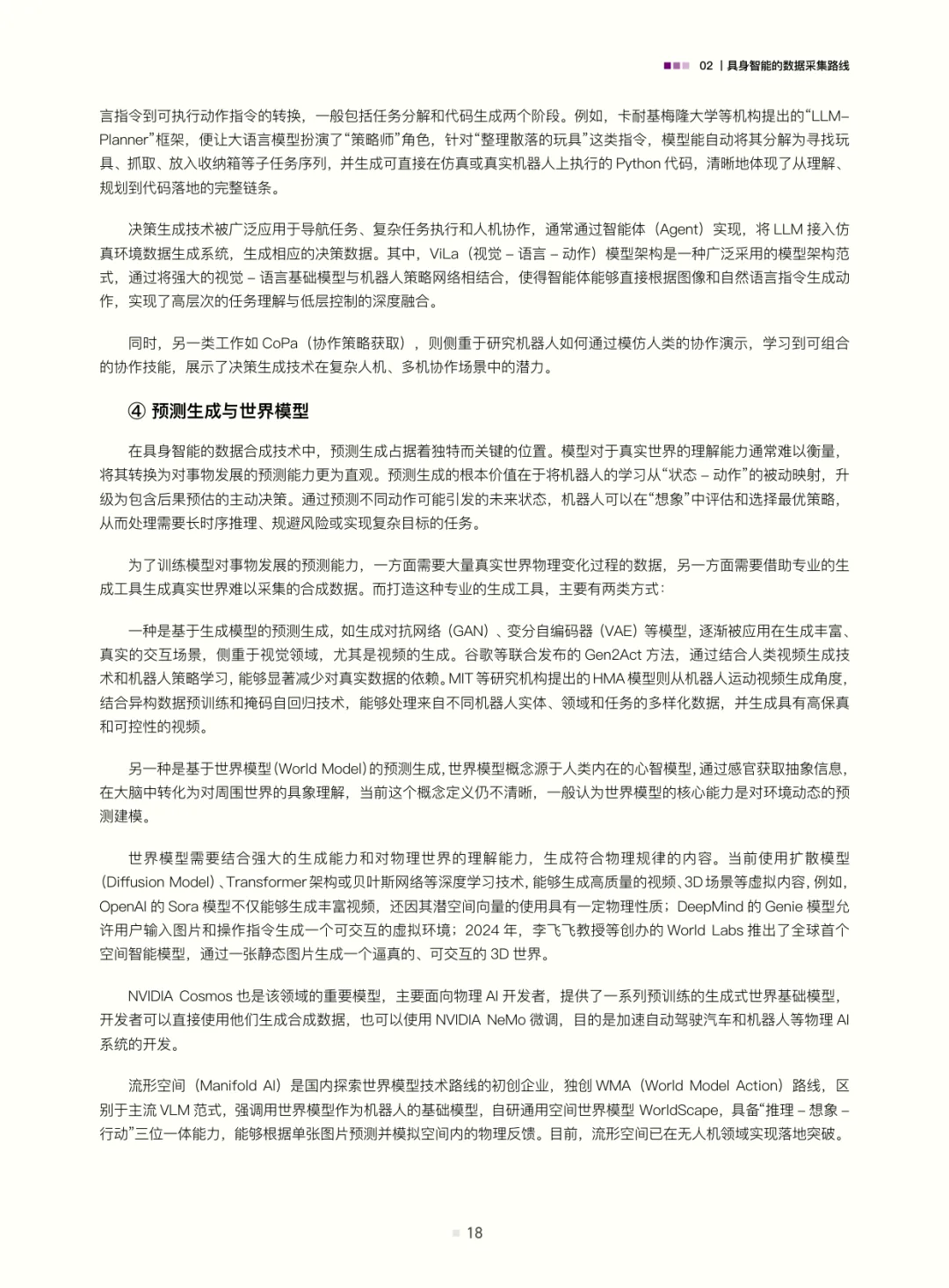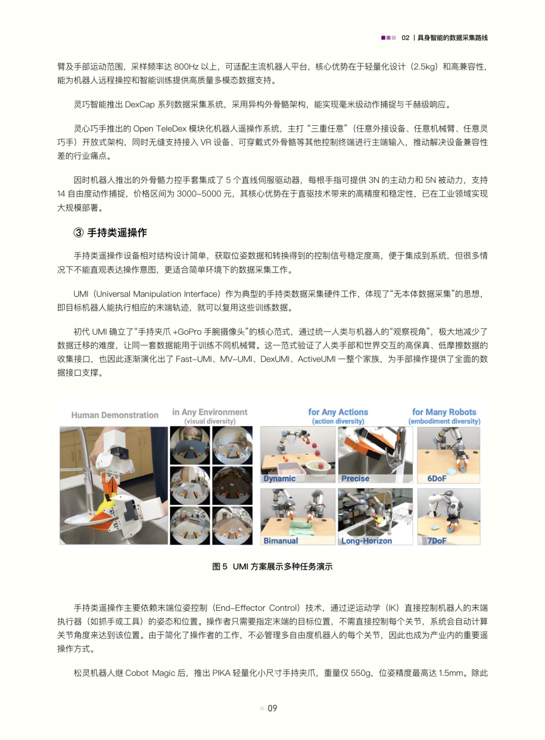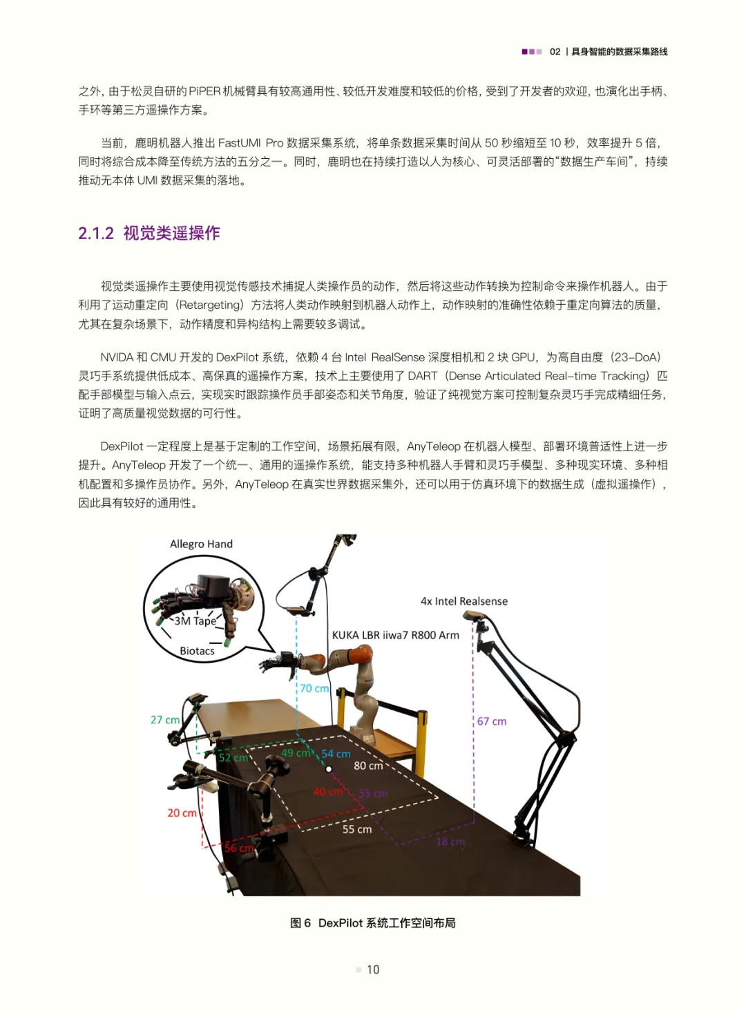 白皮书梳理了具身智能的数据采集路线:遥操作数据(含位姿类、视觉类、光惯类,是当前高质量交互数据的主流来源)、动作捕捉数据(连接真实与数字仿真的关键桥梁)、互联网视频与合成数据(潜力大但需攻克应用难题);结合自动驾驶数据发展经验(从依赖高精地图的静态数据到仿真与真机融合的动态体系,揭示“仿真优先、真机验证”及数据异构融合的重要性),评估了具身智能数据发展现状——真机遥操作数据是“黄金标准”但泛化与规模受限,无本体数据采集(如UMI、轻量化动作捕捉、人类视频)可破“成本-规模-多样性”三角,仿真系统是必要非完美工具(需解决Sim2Real gap与复杂交互模拟难题)。