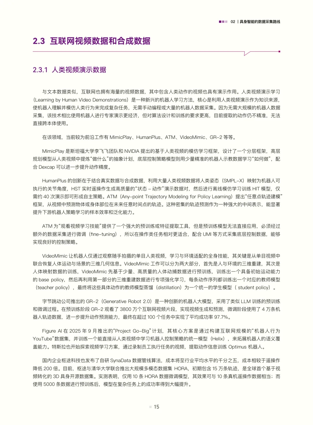 最后,白皮书总结机会与风险:机会包括感知技术创新(多模态数据入口)、数据采集与治理(标准化底层基建)、垂直场景解决方案(加速落地)、真机失败数据(提升模型鲁棒性)、世界模型(通往通用智能的潜在路径)及数据路线多元探索;风险涉及技术架构迭代、数据可用性验证投入、数据安全与伦理监管、产品安全保障缺失、生态与标准缺失及商业化不及预期。附录还整理了BridgeData、Open X-Embodiment、Human3.6M等常见操作与运动数据集,为行业提供参考。