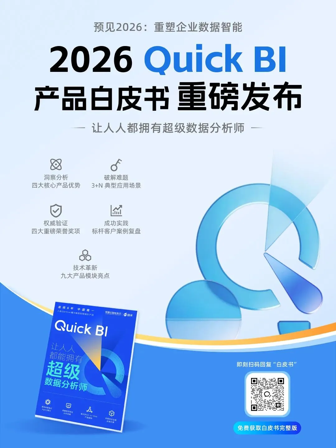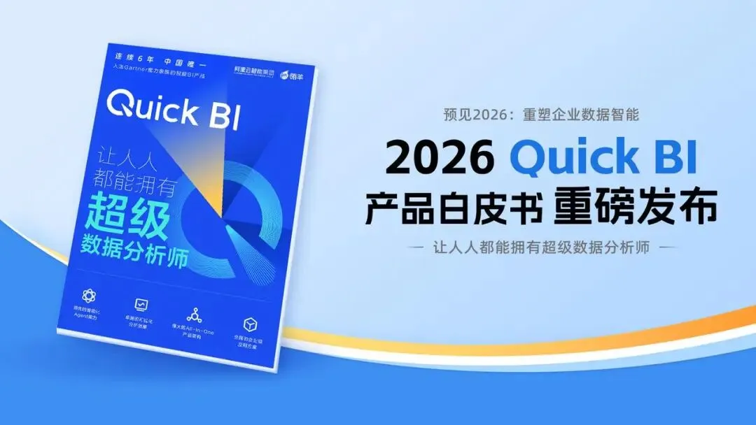 还在为找BI产品全功能指南头疼?还在纠结Quick BI各模块怎么落地用?这次不用翻遍全网找资料了——Quick BI团队历时3个月打磨的《2026 Quick BI产品白皮书》正式发布,100页纯干货,从核心优势到实操功能,从行业案例到荣誉解读,一站式把Quick BI吃透!这份白皮书不是简单的功能堆砌,而是围绕 产品核心优势、典型应用场景、重磅荣誉奖项、标杆客户案例、核心功能亮点 五大核心板块展开,务实呈现产品全貌。不管是刚接触Quick BI的新用户,还是想深挖产品功能的老用户,都能在里面找到自己需要的内容:新用户快速入门抓功能亮点,老用户系统梳理产品框架,真正做到一本在手,全功能都有。本次白皮书把Quick BI的核心优势凝练成四个关键词,从技术到落地全方位覆盖,这也是它能成为企业数据分析核心工具的关键:- 强大的All-In-One产品架构,一站式满足数据分析全需求