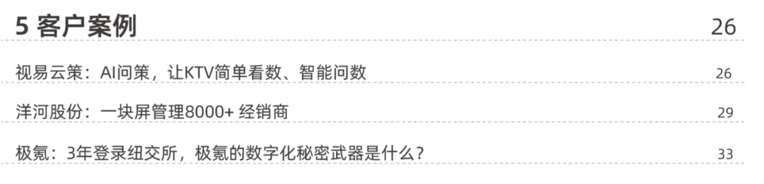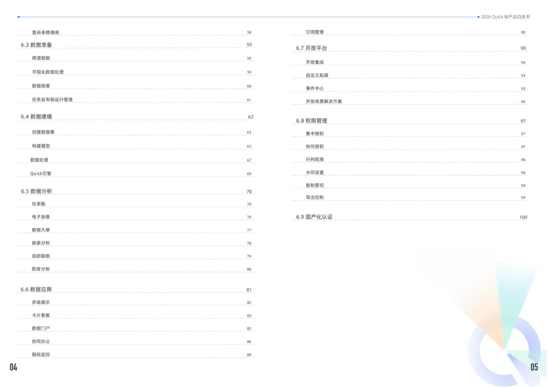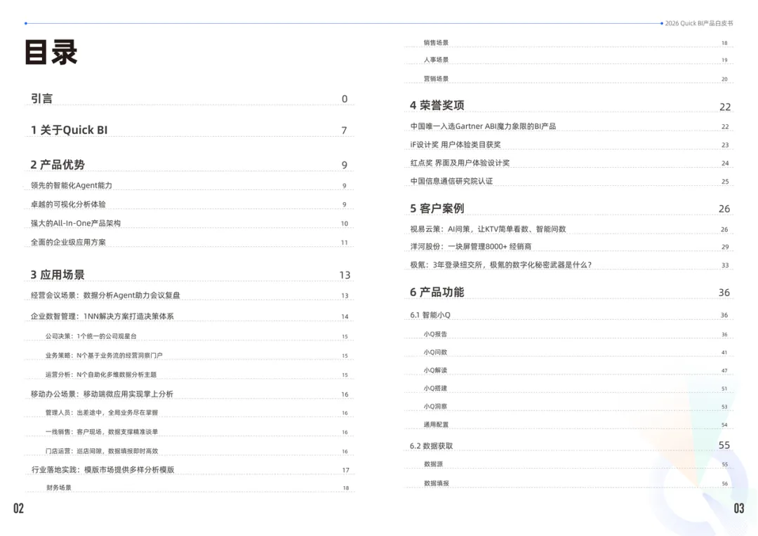 从行业权威认证到国际设计大奖,把每一份荣誉背后的硬实力讲透,让你清楚知道Quick BI的行业认可度到底有多高。作为All-In-One的数据分析产品,Quick BI有数十个功能模块,这次白皮书基于用户需求,重新梳理了功能介绍链路,和官方文档结构保持一致,还更新了所有重点模块的功能特点。更重要的是,里面还加入了 即将上线的小Q洞察、探索分析 等最新功能,让你提前感知产品新能力。核心功能模块全覆盖,从智能小Q的问数、报告功能,到数据获取、准备、建模,再到数据分析、应用、开放平台、权限管理、国产化认证,每个模块的核心亮点都讲得明明白白。光说功能不够,实际落地才是关键。白皮书里抽录了多个标杆客户的真实案例,看Quick BI在不同行业、不同场景的落地效果:- 极氪:成为数字化转型的核心武器,助力3年登录纽交所