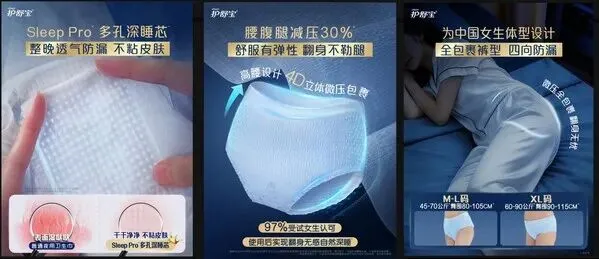 针对经期夜晚"闷、勒、怕漏"三大痛点,护舒宝「减压深睡裤」以三大核心科技系统进行针对性回应:Sleep Pro<多孔深睡芯~可实现整晚透气#、防漏、不粘肤,减少闷热潮湿对睡眠的干扰;4D立体微压包裹专为中国女性体型设计,实现腰腹腿减压30%+,带来舒服有弹性的穿着体验,翻身不勒腿,让身体更易放松;全包裹裤型结合四向防漏设计,则有效缓解夜晚对侧漏的担忧,给予整夜安心感。在产品测试阶段,96%受试女生认可使用护舒宝深睡裤后拥有更深度睡眠#。