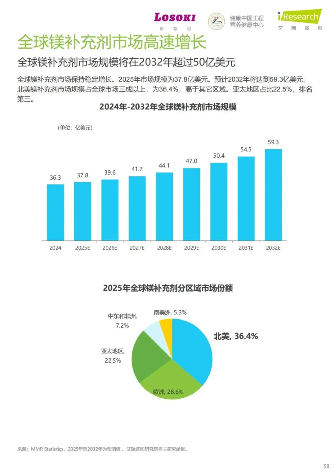 1.全球市场高速增长,中国市场潜力巨大:全球镁补充剂市场规模预计2032年将突破59亿美元,北美是最大市场,亚太地区占比22.5%。中国补镁市场目前仍处于“认知启蒙期”,但随着镁科普的深入,未来增长空间巨大。