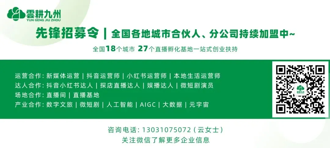 北京云耕九州文旅科技集团有限公司,是由北京3W集团3W COFFICE、海南格物文旅集团共同成立的一家专注于数字文旅微短剧产业基地的运营服务公司。集团专注于建设运营数字文旅微短剧产业基地,在全国范围内构建“微短剧+文旅+电商+本地生活+IP孵化”共创平台,赋能实体产业数字化转型升级。将短剧基地打造成为现在直播基地一样,成为地方文旅产业标准件,做中国城市数字文旅发展的先行者和引领者。