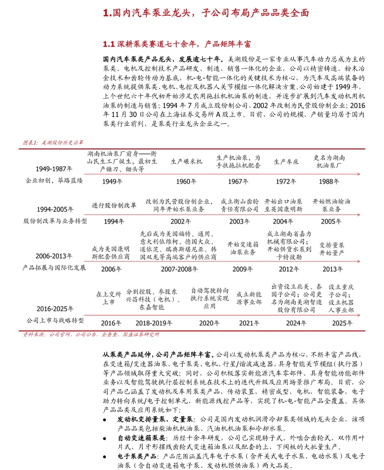 摘要:本报告详细分析了作为泵类龙头的美湖股份的业务布局与增长潜力,让行业从业者与投资者深入了解其核心价值与发展逻辑。公司深耕泵类赛道七十余年,柴油机机油泵国内市占率40%,客户覆盖康明斯、比亚迪等巨头;新能源电子泵业务加速放量,同时布局机器人谐波减速器、智驾执行层控制系统等新兴赛道,多业务协同打开长期成长空间,为把握细分领域投资机遇提供清晰指引。