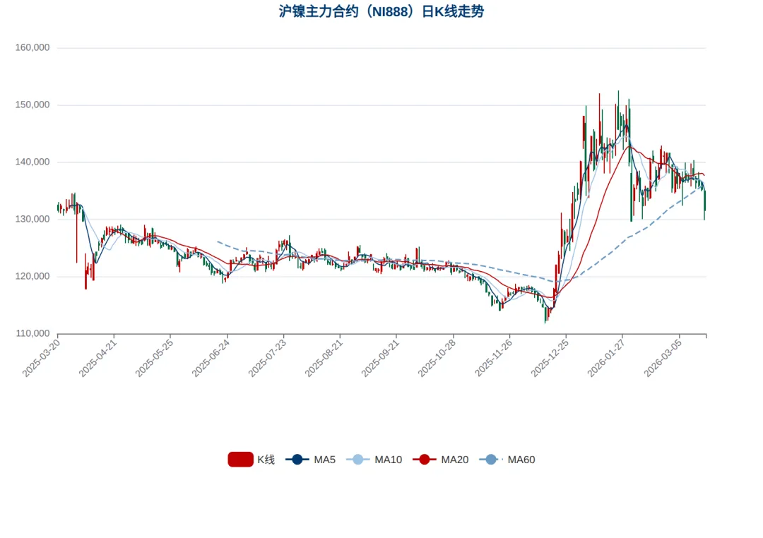 沪镍主力合约(NI888)在过去一年经历了显著的价格波动。2025年3月至9月期间,镍价在111,770-132,000元/吨区间内震荡筑底,底部反复确认后于2025年10月开启上行通道。受印尼RKAB配额削减预期升温、高盛上调镍价预测等多重利好推动,沪镍于2026年1月26日冲高至年内最高点152,500元/吨,区间涨幅高达36.5%。
