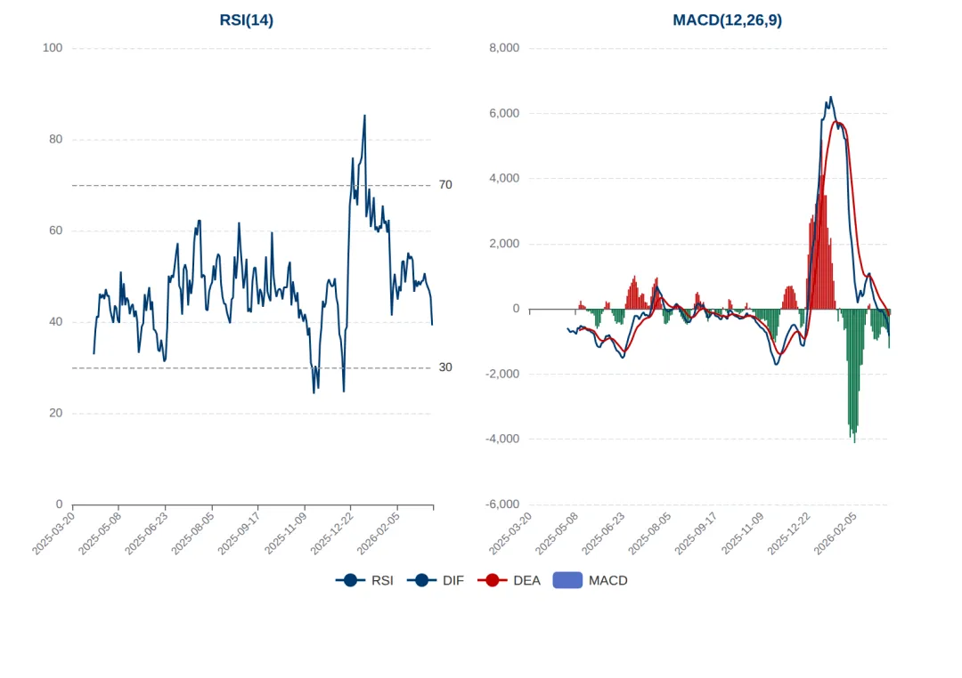 RSI(14日):当前读数39.24,处于偏弱区间(40以下)但尚未触及超卖区域(30以下)。这表明下跌动能仍在释放中,但距离技术性超卖反弹尚有空间。若RSI进一步下探至30附近,则可能触发短期超卖反弹。