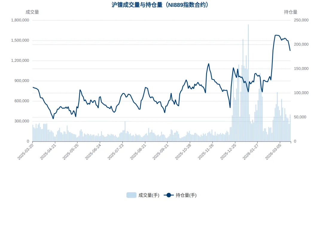 成交量和持仓量是观察市场参与者行为的重要窗口。沪镍近期成交量数据(基于NI889指数合约)显示,市场活跃度在价格下跌过程中有明显变化。最新交易日成交量为398,352手,持仓量为186,757手。