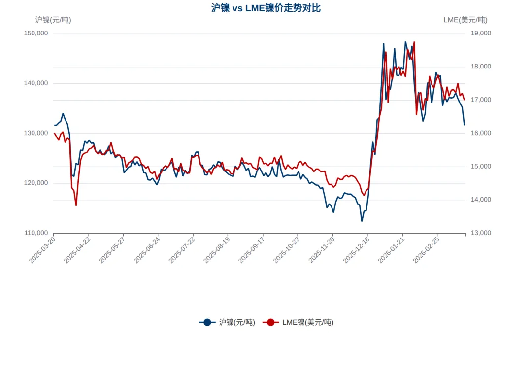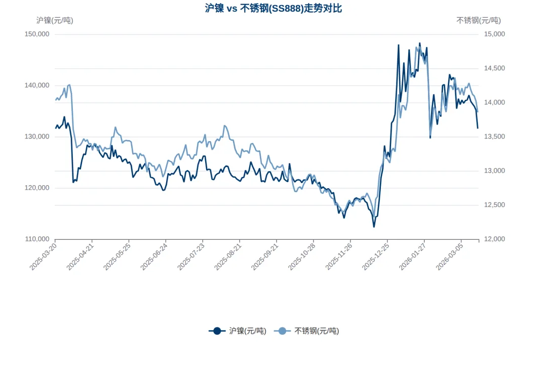 从沪镍与不锈钢价格的联动关系来看,两者近一年的相关系数达到0.92,显示出高度正相关。不锈钢价格的涨跌对镍价有直接的传导效应。下图展示了两者的走势对比: