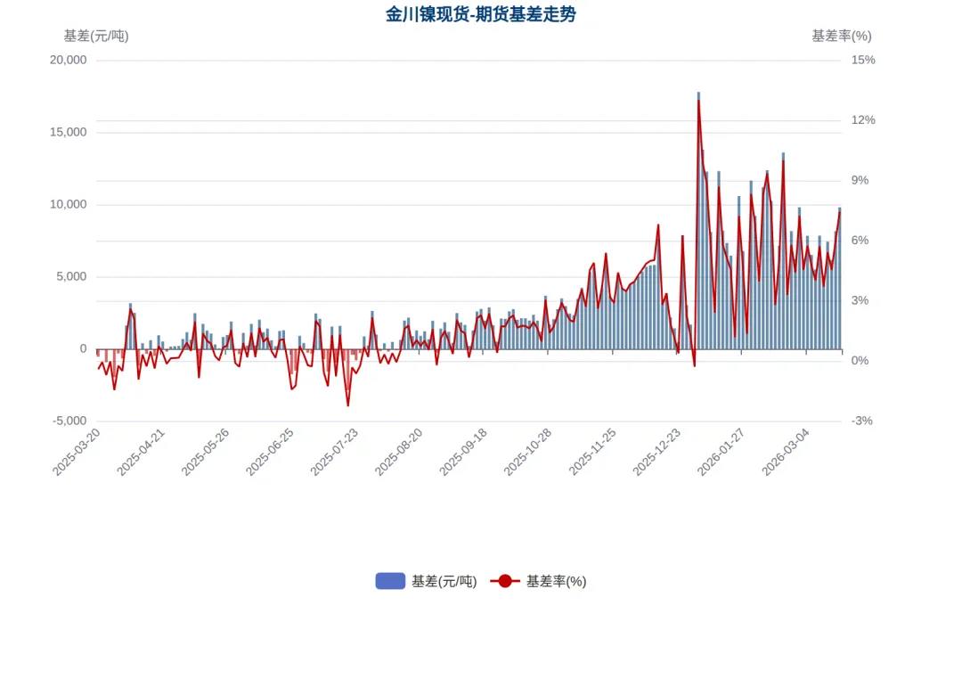 基差(现货价格 - 期货价格)是衡量现货市场供需紧张程度的重要指标。当前金川镍现货价格约141,350元/吨,沪镍主力期货约131,550元/吨,基差为+9,800元/吨(基差率约+7.45%)。