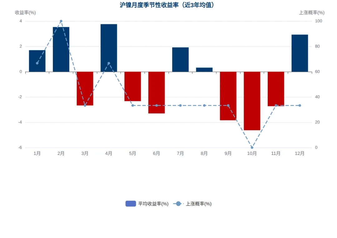 从季节性分布来看,1-2月和4月是历史表现较强的月份。1月平均收益率+1.70%(上涨概率67%),2月表现尤为突出,平均收益率+3.53%(上涨概率100%),4月平均收益率+3.76%(上涨概率67%)。这与有色金属传统的"春季躁动"行情有一定吻合——年初资金面宽松、补库预期升温等因素通常对有色板块构成支撑。