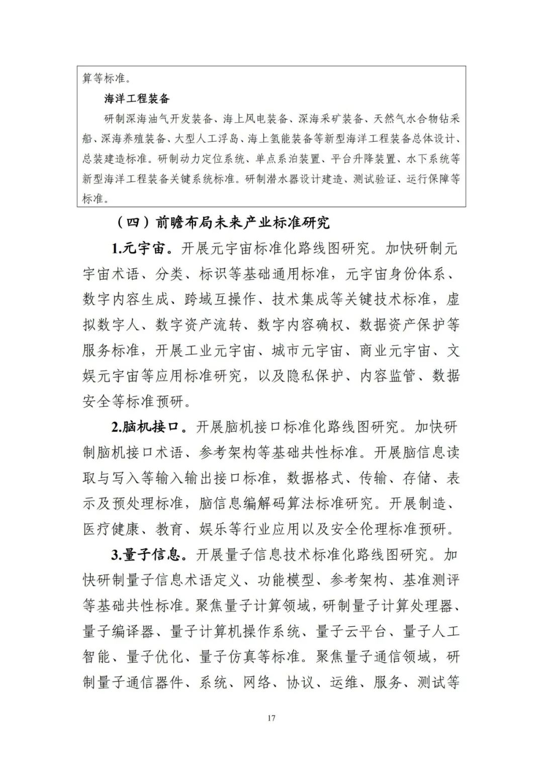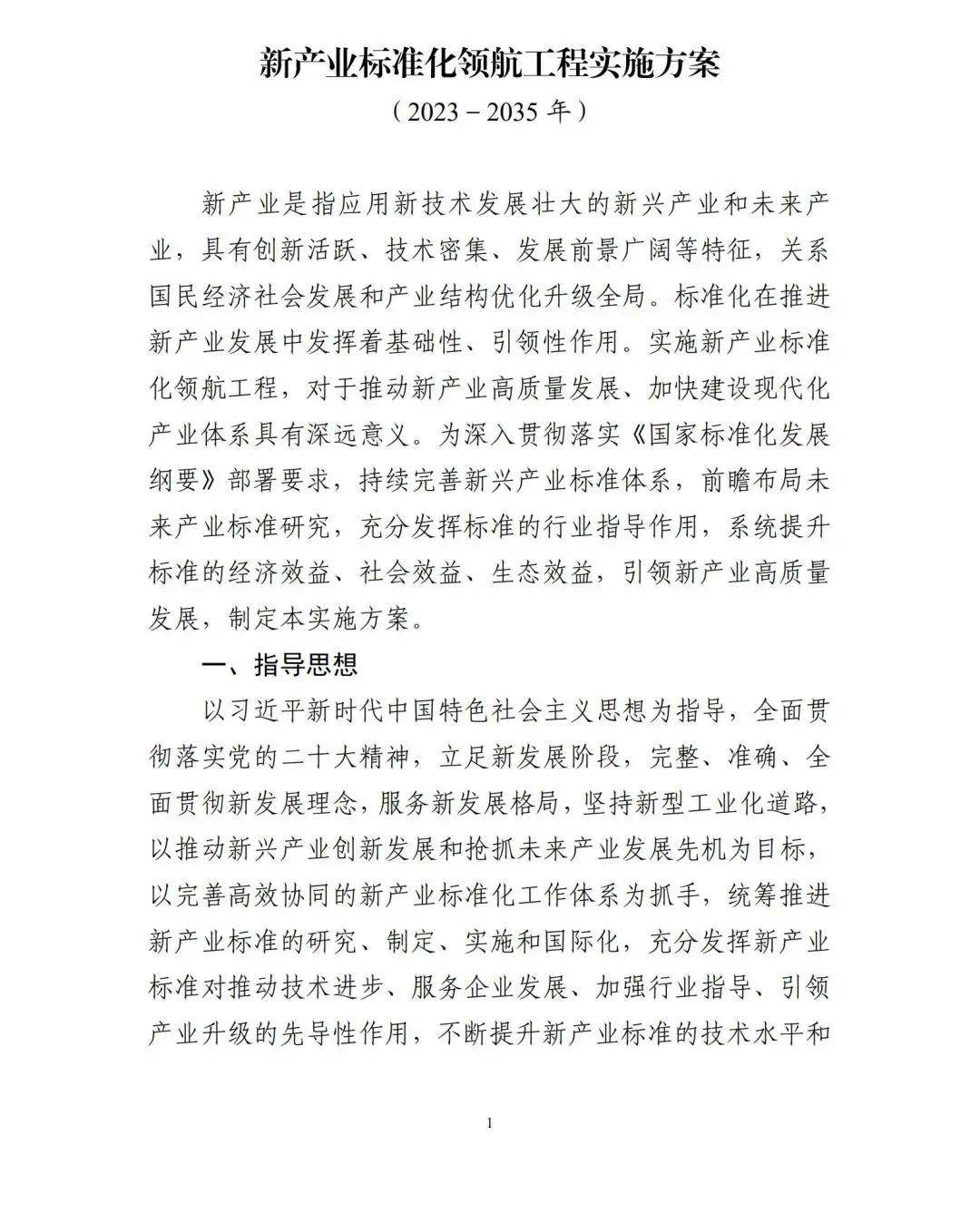 为贯彻落实《国家标准化发展纲要》,持续完善新兴产业标准体系建设,前瞻布局未来产业标准研究,充分发挥标准的行业指导作用,引领新产业高质量发展,工业和信息化部、科技部、国家能源局、国家标准化管理委员会组织编制了《新产业标准化领航工程实施方案(2023─2035年)》。现印发你们,请结合本地区、本行业实际,抓好贯彻落实。