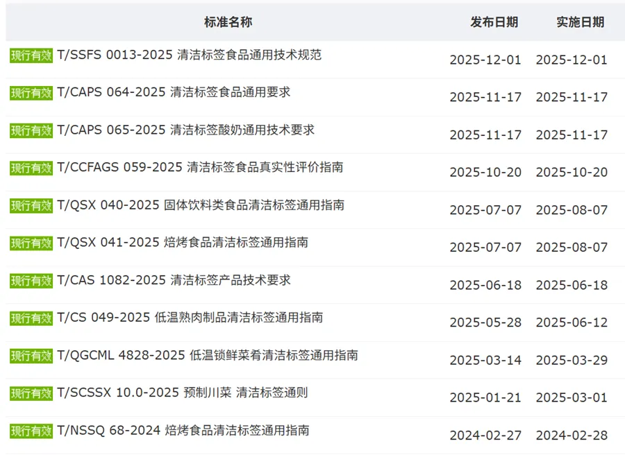 目前,“清洁标签” 在全球范围内尚未形成统一、明确的标准定义,但我国已率先启动相关规范建设。现有的 “清洁标签” 相关团体标准多集中于 2025 年发布,为行业发展打下了初步基础。期待未来能逐步出台更具约束力的行业标准、地方标准乃至国家标准,为清洁标签食品的健康发展提供更权威的指引。