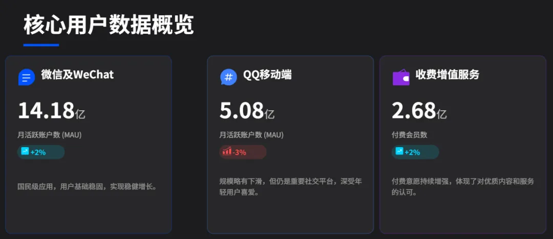 1、微信月活账户同比+2%;qq同比-3%;付费会员数+2%