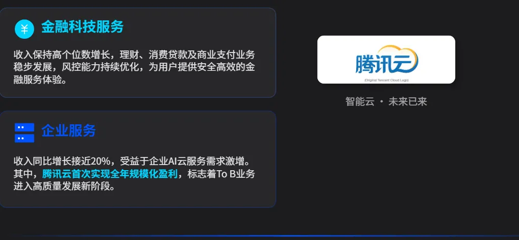 "云服务也是首年实现规模化盈利,金融科技及企业服务毛利率51%,同比+17%"