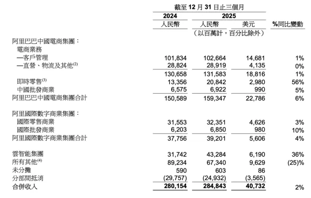 从核心数据看,阿里本季度营收实现温和增长,但利润端承压。财报显示,公司2026年第三季度收入达2848.43亿元人民币,同比增长2%;若剔除高鑫零售和银泰已处置业务影响,同口径收入同比增长9%。显示出核心业务增长依然强劲。