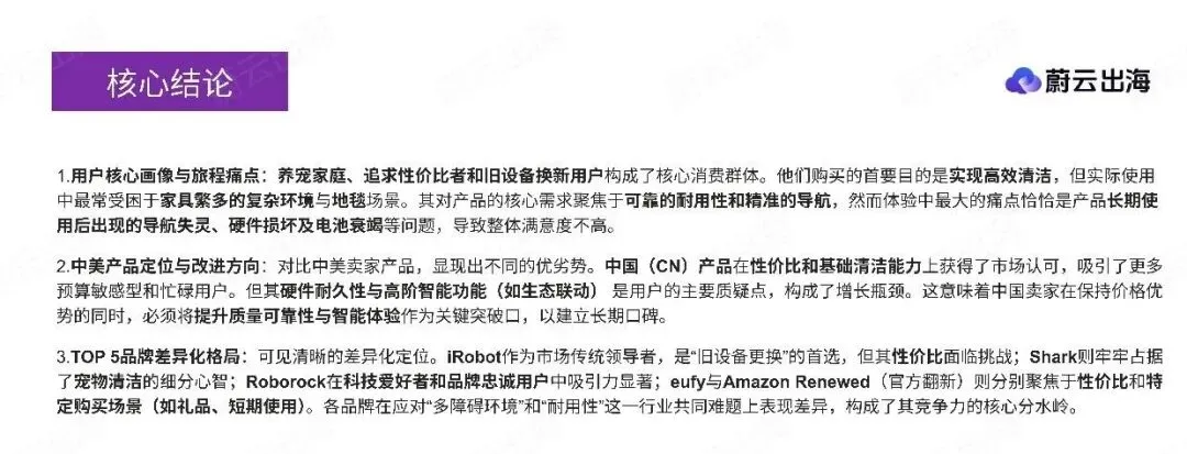 第三部分“竞争差异洞察”,对比了中美卖家及Top 5品牌(Shark, Amazon Renewed, iRobot, eufy, Roborock)。分析发现,中国产品更吸引“性价比追求用户”,但在“机械耐久性”等长期使用痛点上机会指数更高;美国产品在“旧设备更换”心智上更强。各品牌定位差异明显,例如Shark在“宠物清洁”场景占据用户心智,而iRobot则是“旧设备更换”的首选。