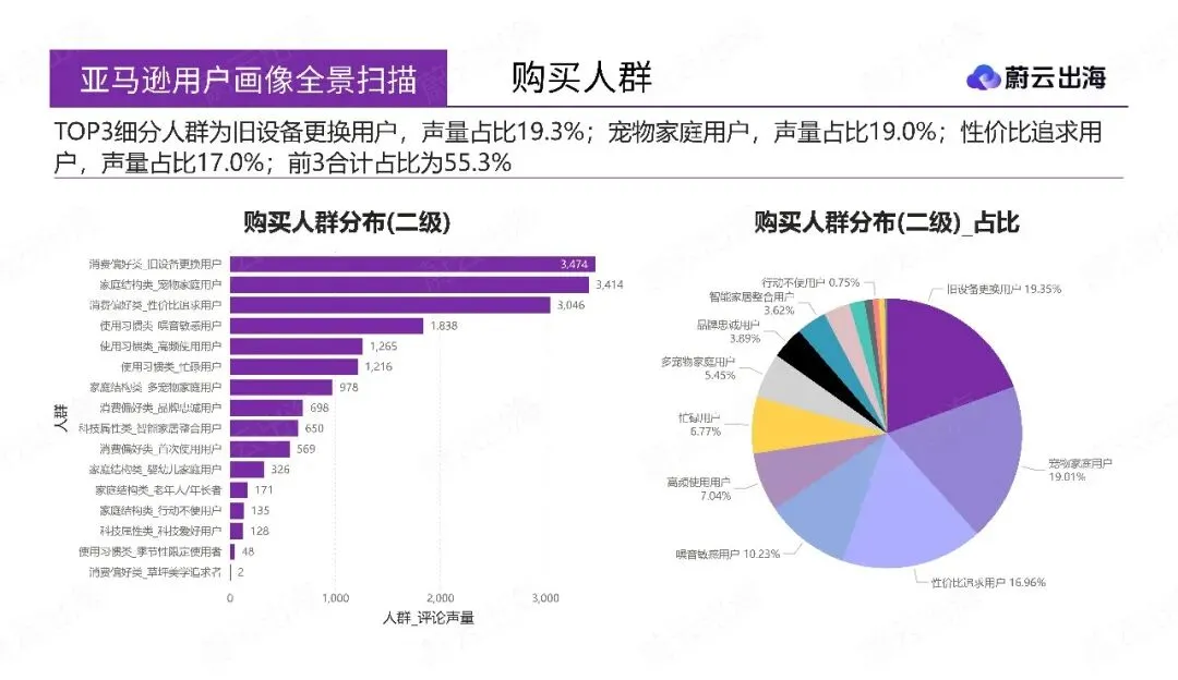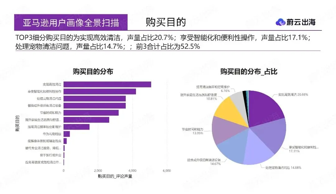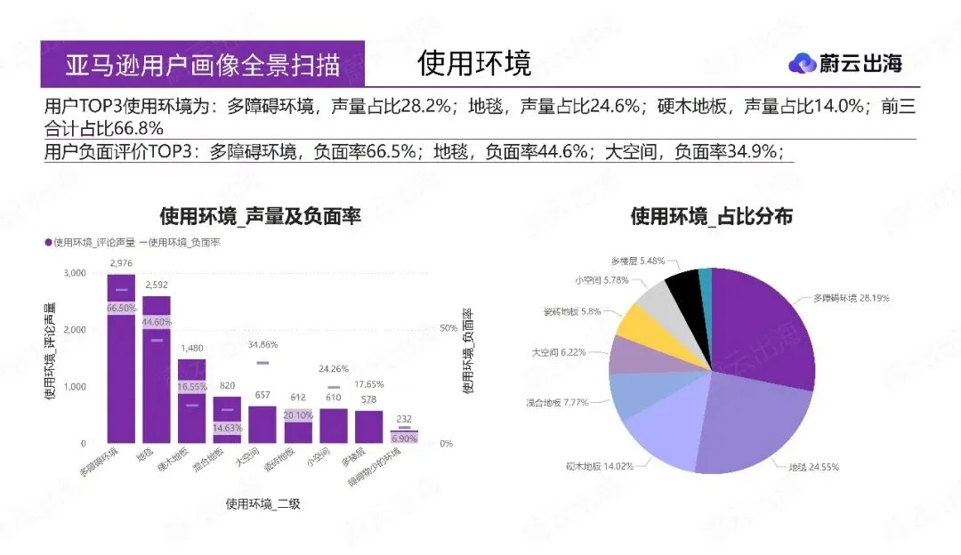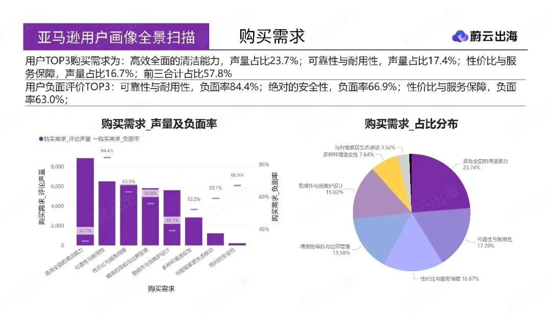 第二部分“用户行为深度洞察”,通过交叉关联分析,揭示了核心人群的复合身份与差异化痛点。例如,“性价比追求用户”与“旧设备更换用户”、“宠物家庭用户”高度重合;该人群对“可靠性与耐用性”和“脱困能力”最为敏感,机会指数突出。