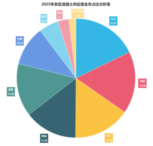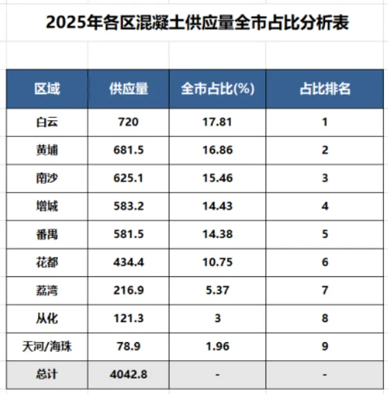 根据广州市预拌混凝土生产数据全程实时监管系统的统计,2025年行业实际供应混凝土量为4042.8万立方,与2024年相比较减少了414万立方,同比下降了9.3%。行业集中度CR10市占24%,与去年接近。
