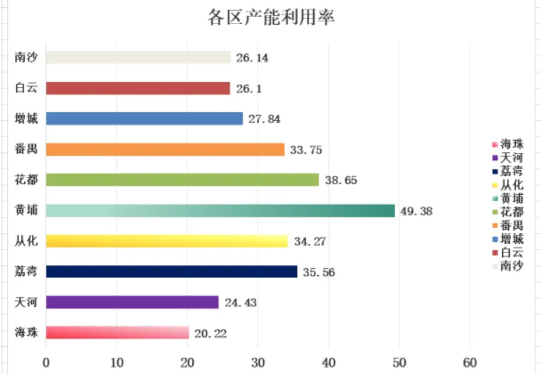 行业产能利用率各区有一定差异,其中黄埔区、花都区企业的产能利用率较高,分别是49.4%和38.6%,海珠、天河两个中心区域企业的产能利用率较低,分别是20.2%和24.4%,全市平均产能利用率仅为31.6%,较2024年下降了5%。