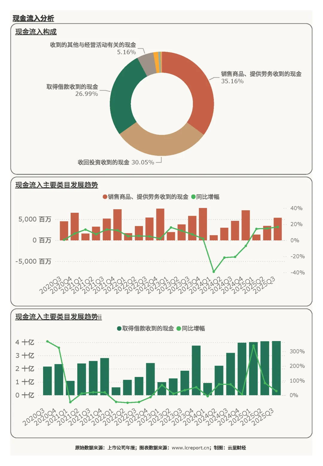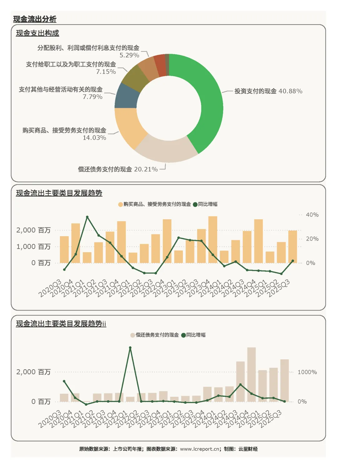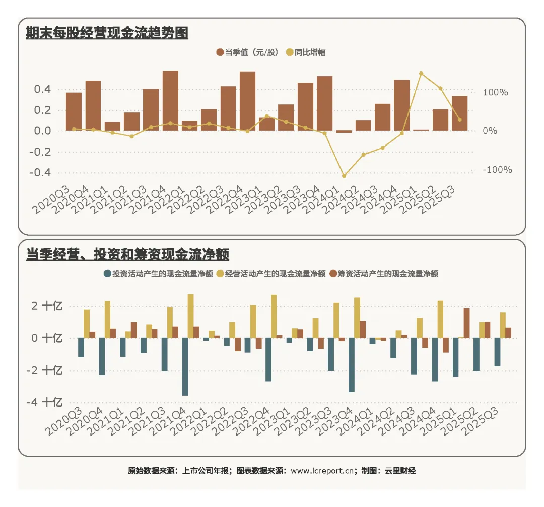 2)经营现金流实现逆势增长,在行业整体现金流承压的背景下,凸显出极强的资金回笼能力,当期大额对外投资推高了投资端现金支出,属于阶段性行为;