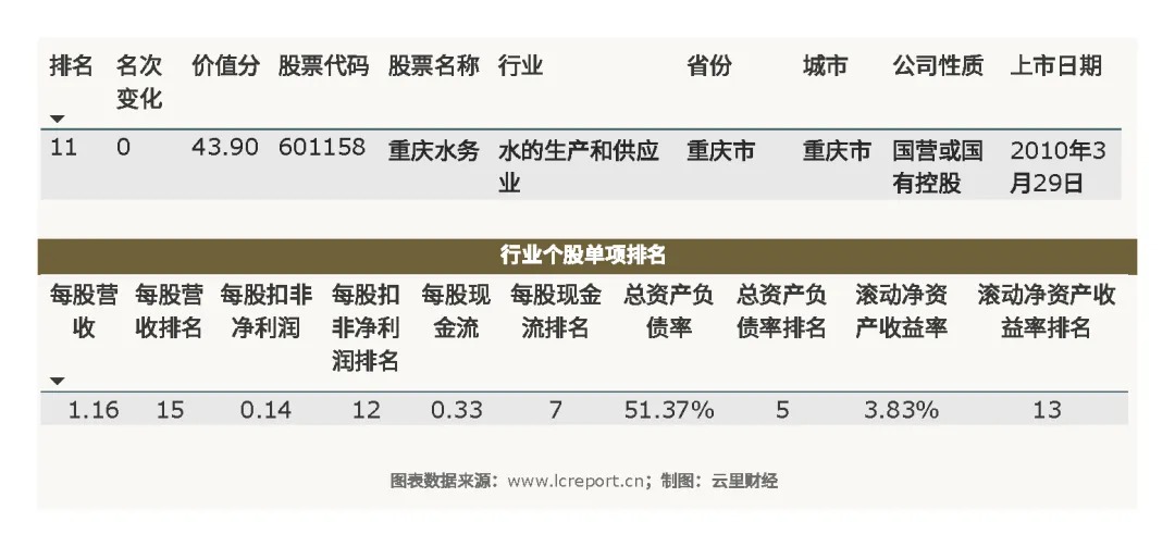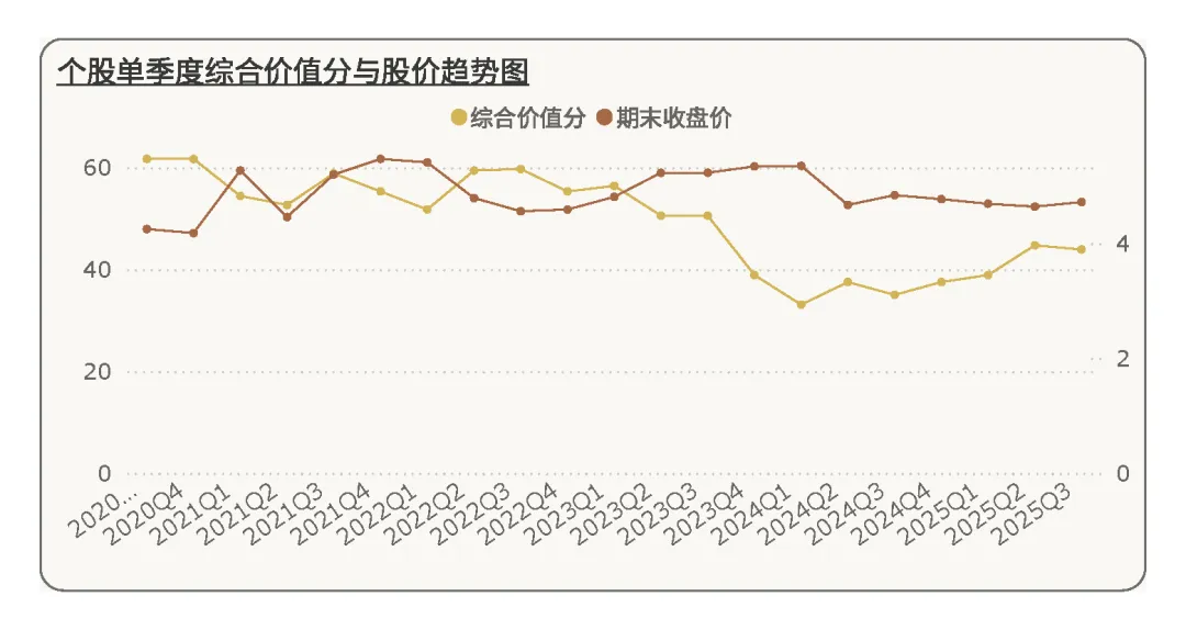 接下来我们来看下重庆水务的综合价值[2]。在2025Q3季度,重庆水务的综合价值分为43.90分,行业排名第11,与上个季度持平。