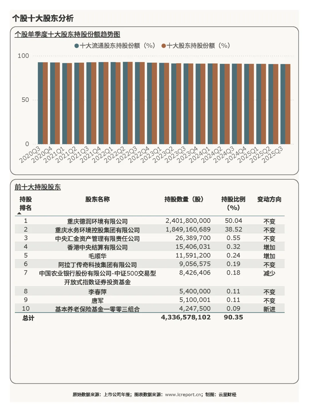 报告期末,重庆水务的总发行股本为48.00亿股,周期内保持不变。
