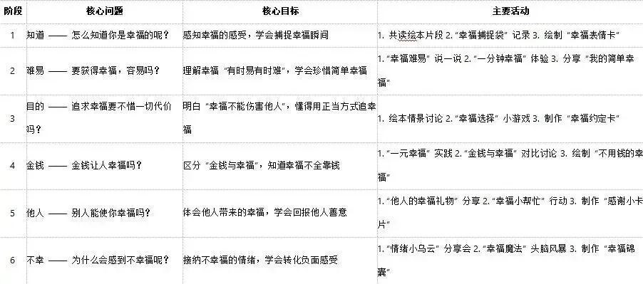 4.情感与价值观发展:学生从最初认为“幸福是糖果、玩具”,逐步理解幸福是陪伴、分享、感恩、关爱,学会发现生活中的小幸福,懂得尊重他人、接纳情绪、传递温暖,形成积极乐观的人生态度。