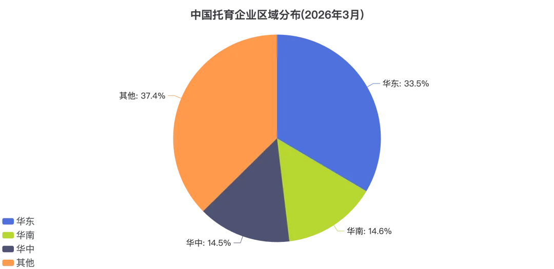 从区域分布来看,华东地区依然是托育行业的“高地”,现存企业数量占比高达33.5%,显示出该地区强大的消费能力和市场化程度。紧随其后的是华南地区(14.6%)和华中地区(14.5%)。值得注意的是,与存量分布略有不同,2025年华中地区的新增注册量已超过华南地区,显示出内陆省份在托育服务需求释放和政策承接上的巨大潜力。
