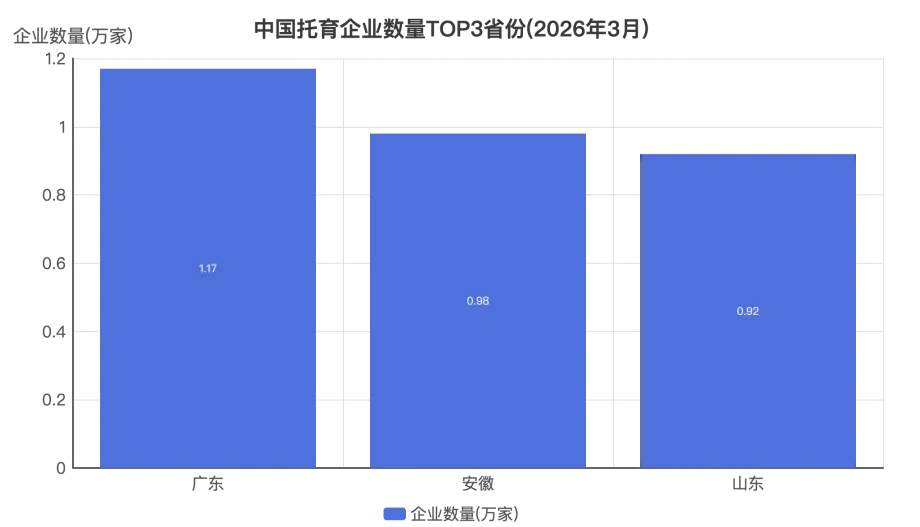 从省份维度看,广东、安徽、山东等地托育相关企业数量位居全国前列,其中广东省以超1.17万家的存量领跑,体现了人口大省对普惠托育服务的迫切需求。