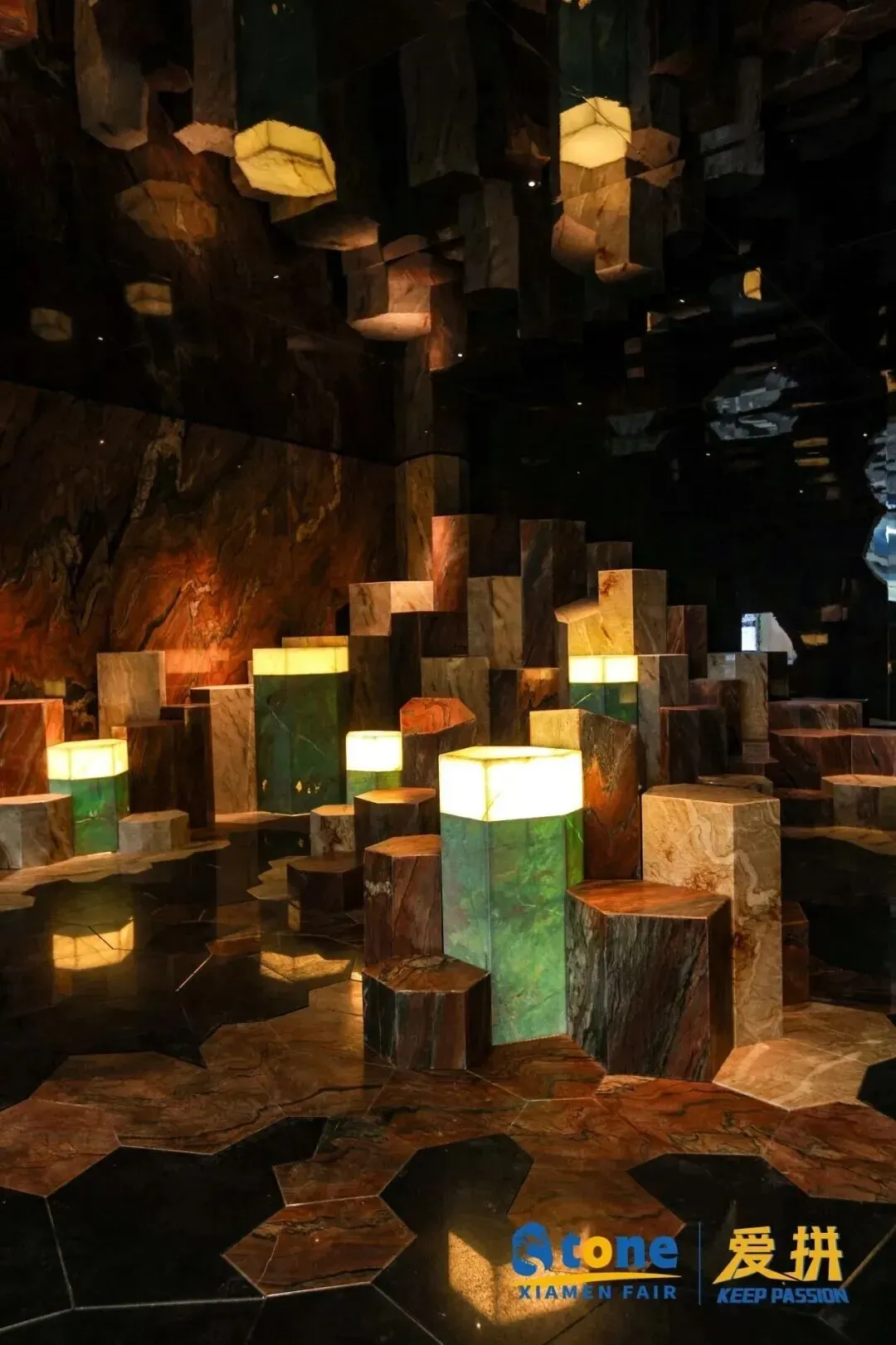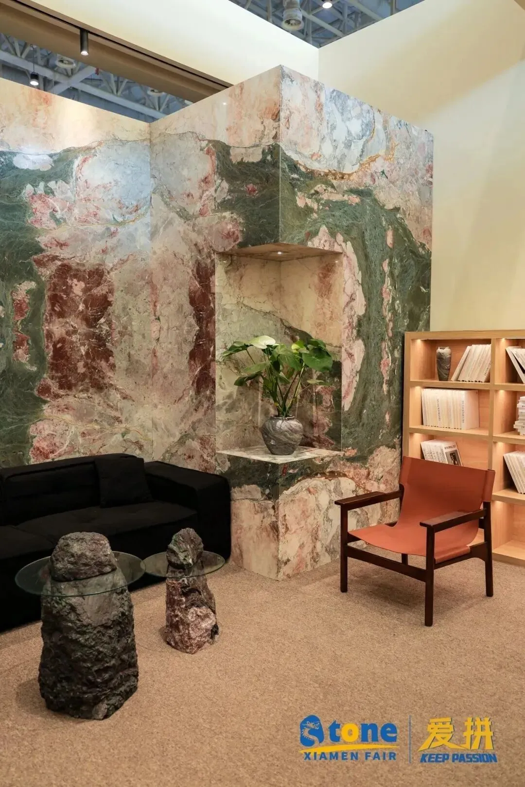 通过现场展区设计的表达,我们能够感受到天然石材在高端住宅设计中覆盖地面、墙面、橱柜、卫浴、楼梯、艺术装置,实现全屋一体化设计;商业空间、酒店、会所中,石材通过不同纹理、色彩、工艺的组合,打造差异化空间IP;极简、轻奢、复古、自然等风格,均能通过石材的选择与搭配完美呈现;