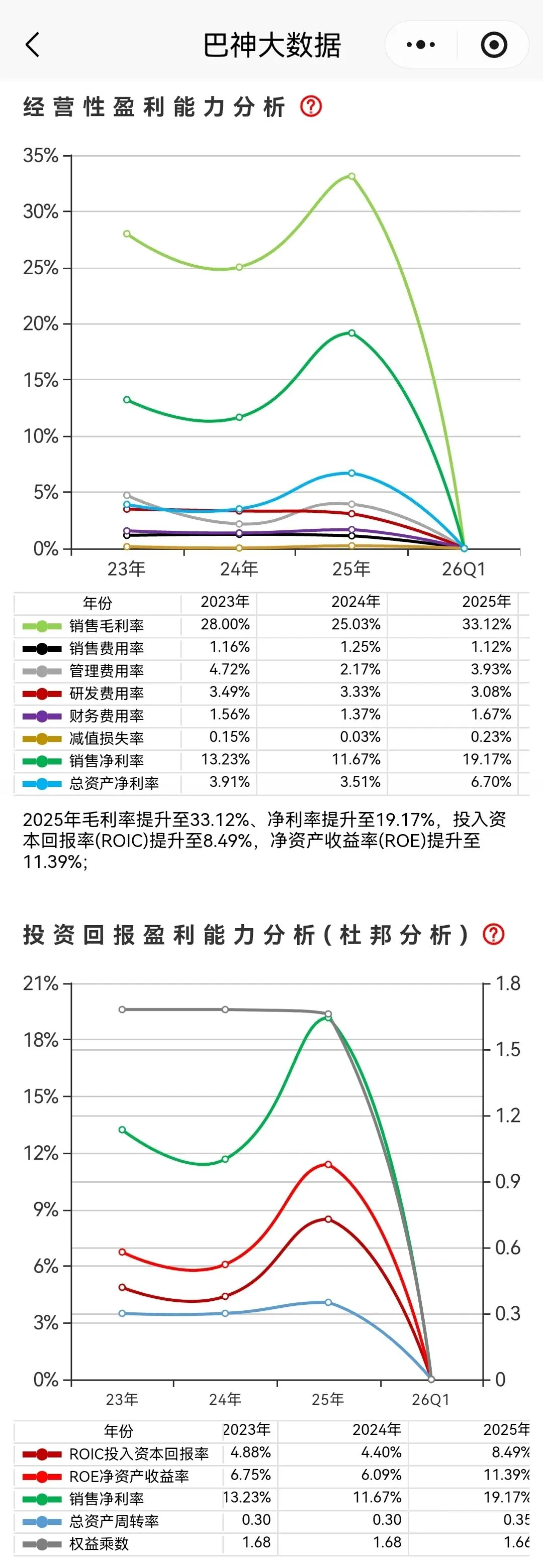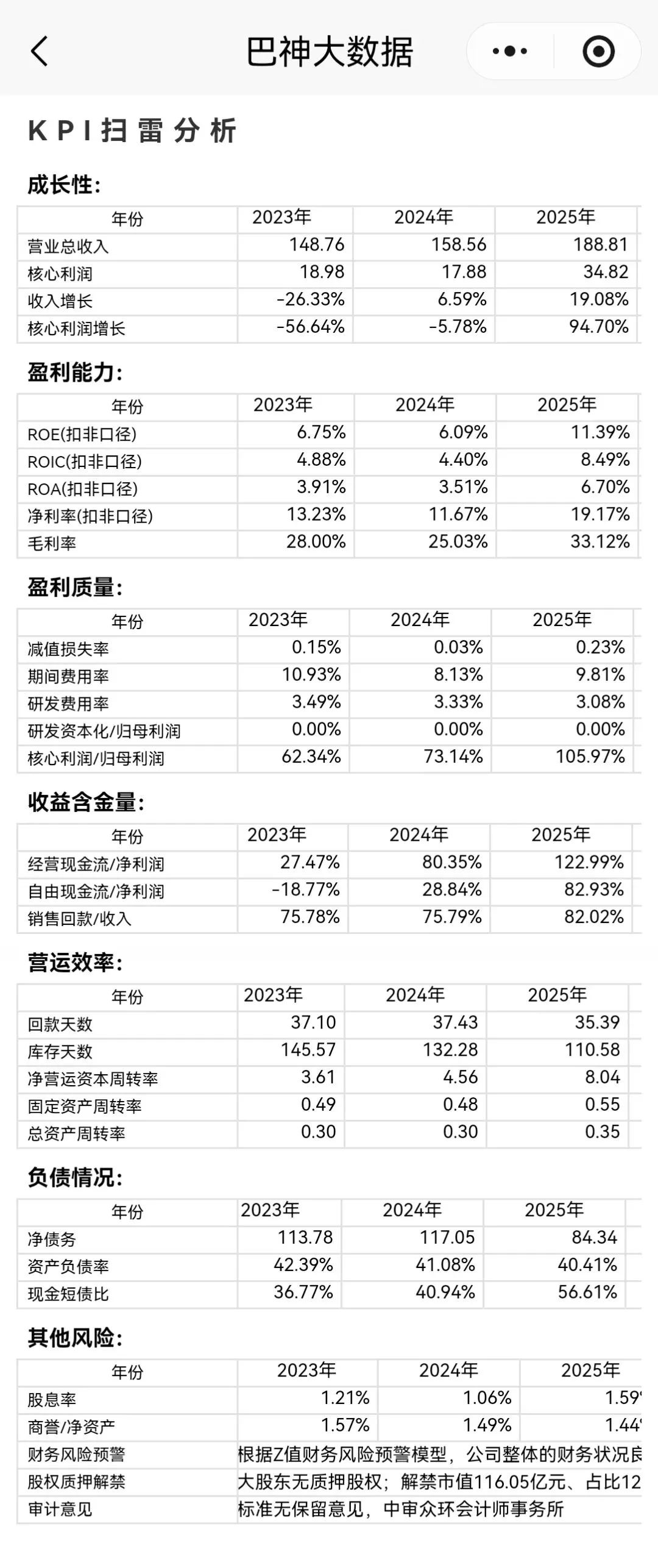 从“KPI扫雷分析”可以看出,公司的盈利能力正在全面修复:毛利率从2024年的25.03%大幅提升至33.12%,净利率从11.67%提升至19.17%,净资产收益率(ROE)也从6.09%回升至11.39%。核心利润的高速增长(94.7%)与经营现金流的充沛(122.99%的净利润现金保障),共同印证了公司盈利质量的高水平。