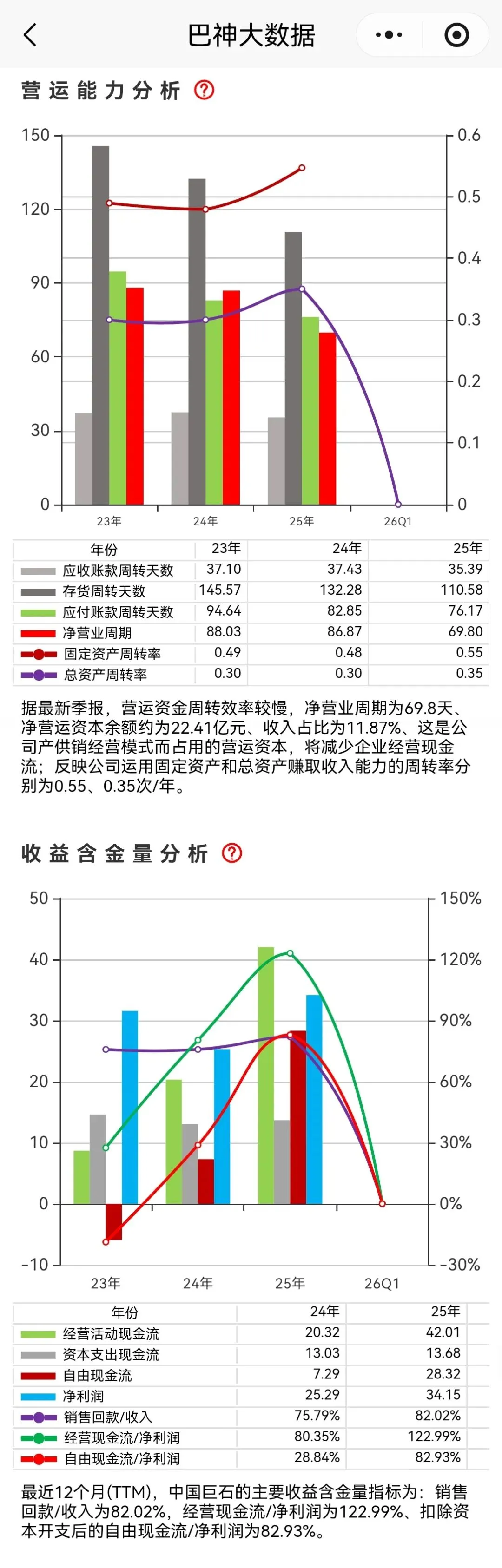 规模优势是巨石的底色,但真正的壁垒在于对全产业链的极致掌控。从自主研发E系列高性能玻璃配方,到浸润剂的国产化突破,再到超大型池窑的节能技术,巨石构建了对手难以复制的成本模型。从“营运能力分析”可见,公司的营运效率正在持续优化:存货周转天数从2023年的145.57天降至2025年的110.58天,净营业周期从88.03天缩短至69.80天,这体现了公司产销协同和库存管理能力的提升。