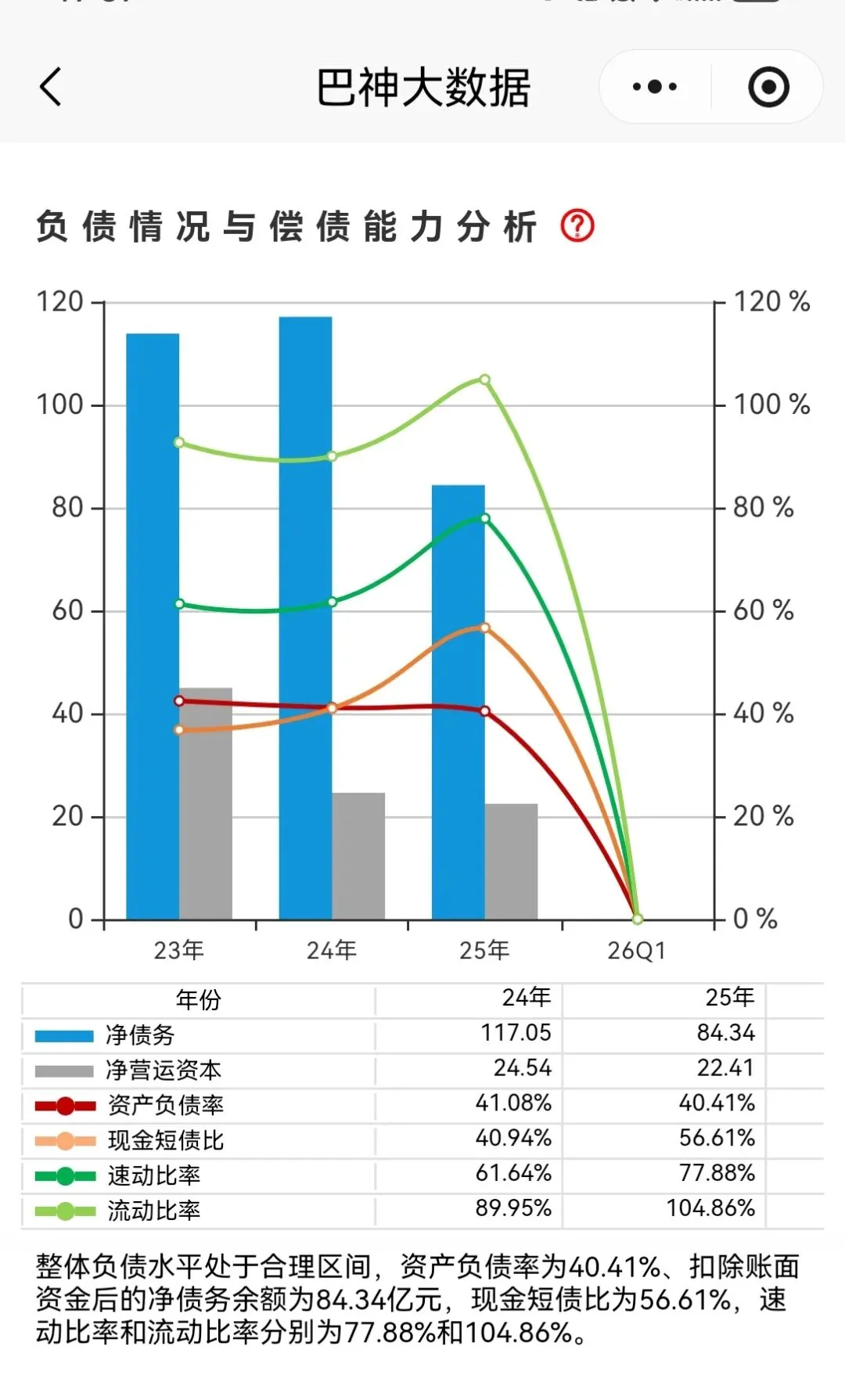 从“负债情况与偿债能力分析”来看,公司财务状况持续向好。资产负债率从2023年的42.39%降至40.41%,净债务从117.05亿元降至84.34亿元,现金短债比从40.94%提升至56.61%,流动性风险显著降低。同时,“收益含金量分析”显示,2025年自由现金流达到28.32亿元,自由现金流/净利润比例从2024年的28.84%跃升至82.93%,盈利质量大幅提高,为高分红提供了坚实保障。