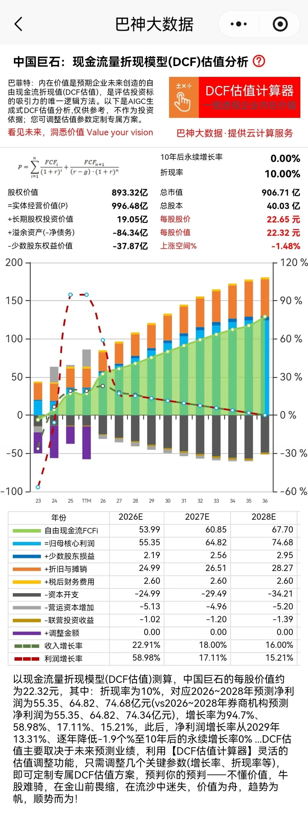 第四,DCF估值提供价值锚点。 根据“现金流量折现模型(DCF)估值分析”,基于2026-2028年预测净利润55.35、64.82、74.68亿元,以10%折现率测算,中国巨石的每股价值约为22.32元。这一估值水平为投资者提供了重要的参考坐标,也反映了市场对公司未来成长性的积极预期。