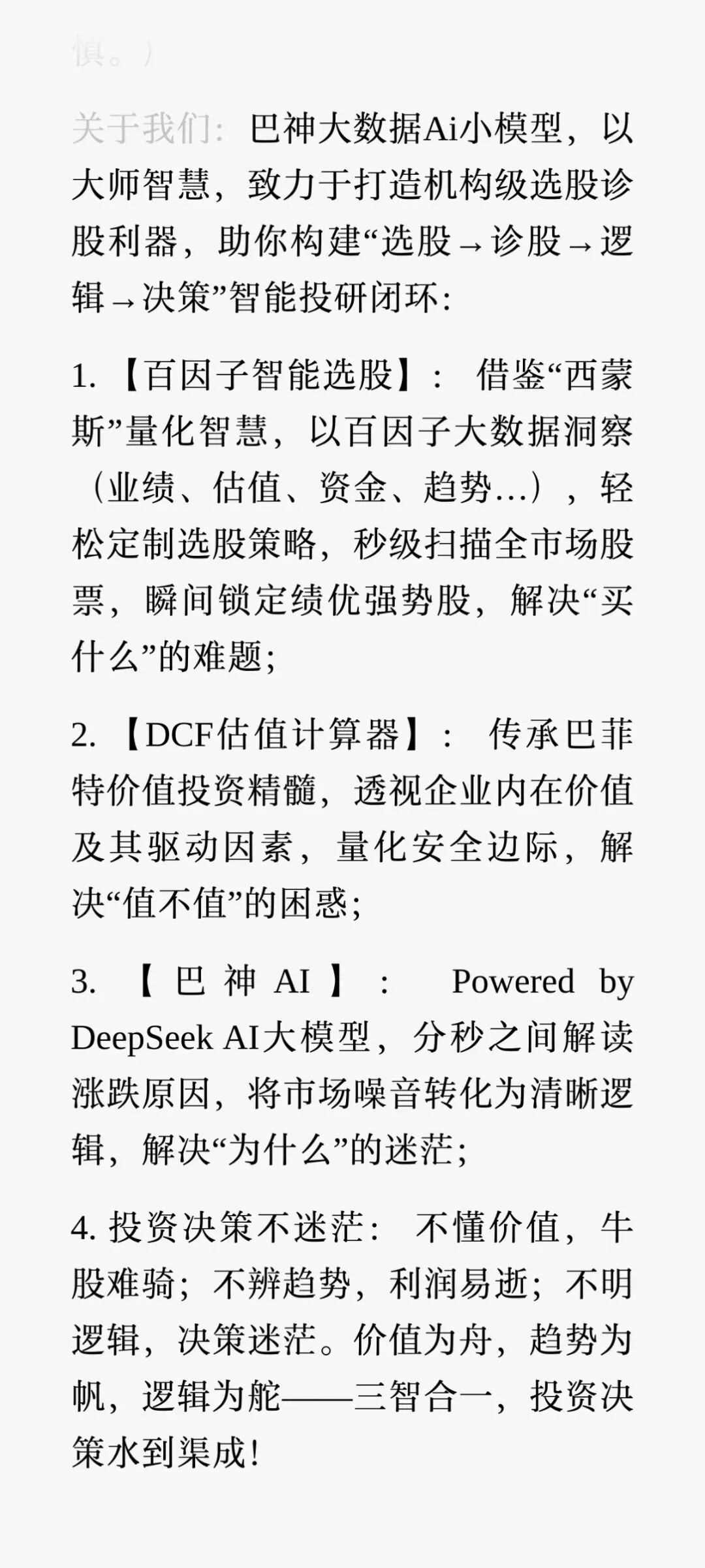 巴神大数据Ai小模型,助你打造“选股→诊股→逻辑→决策”投研闭环!