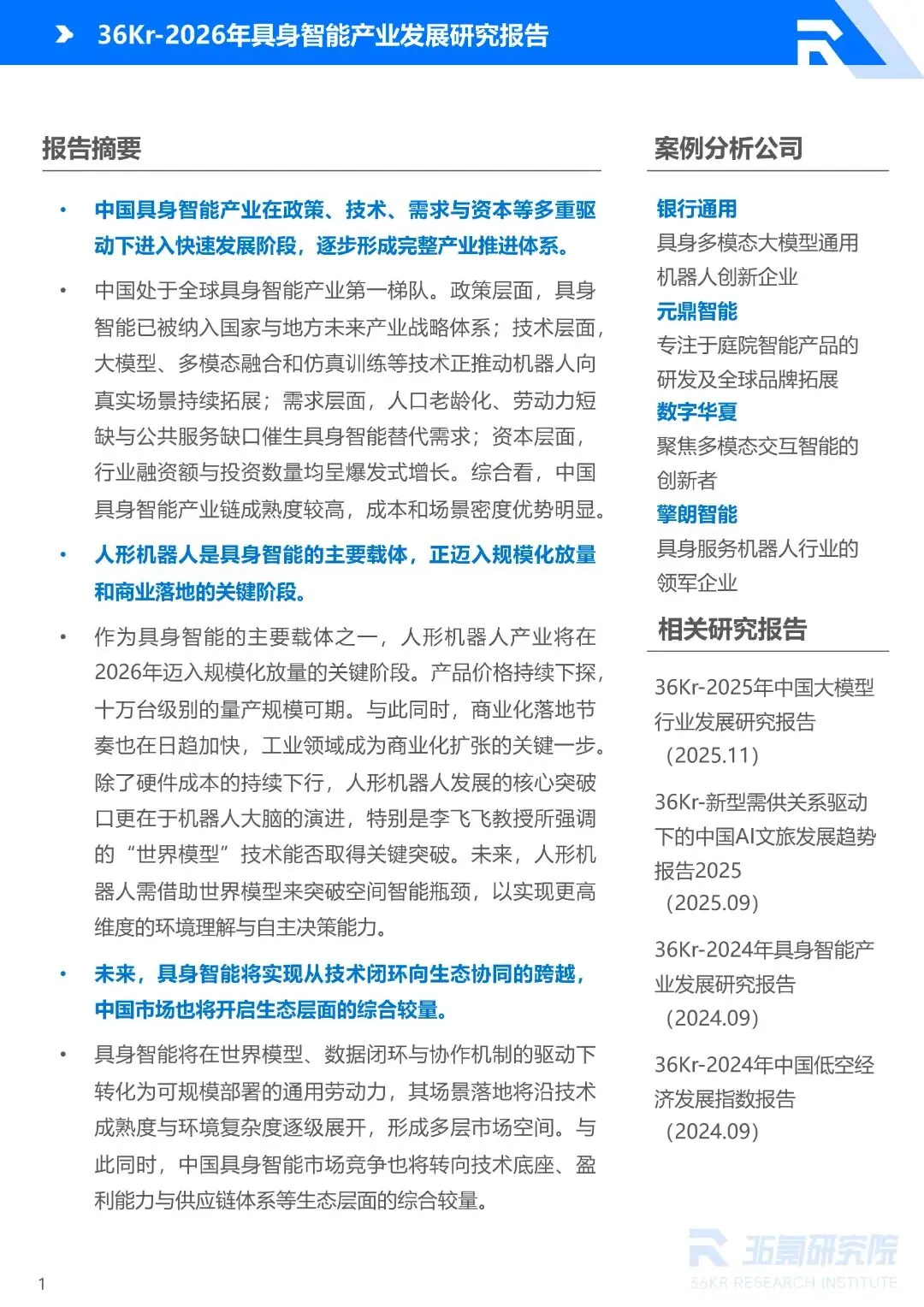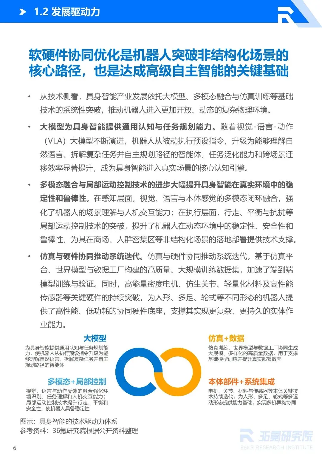 2026年,全球具身智能产业正式告别“概念炒作”“样品展示”的培育期,迈入“规模化量产、商业化闭环、国产化主导”的关键爆发期。以人形机器人为核心载体,以世界模型为技术内核,以工业场景落地为突破口,产业形成“上游核心部件国产化加速、中游整机量产落地、下游场景多点渗透”的完整生态。本报告全面剖析2026年具身智能产业的发展现状、核心技术突破、主流厂商布局、应用场景落地,深度解读产业面临的挑战与机遇,前瞻性预判未来发展趋势,为企业布局、资本投入提供专业参考。