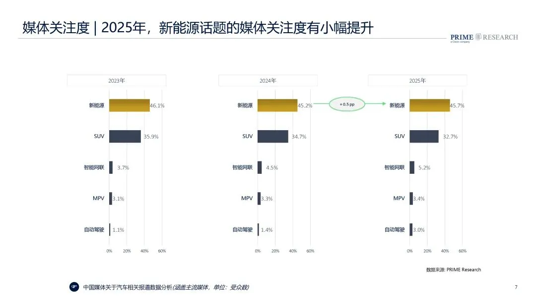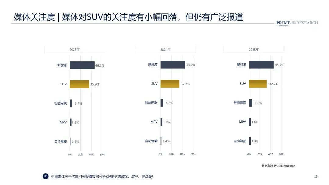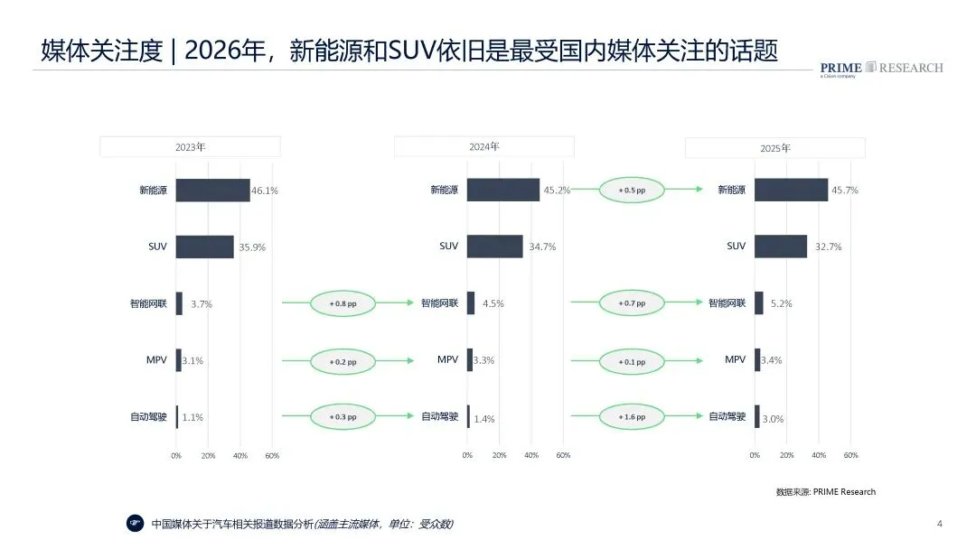 在过去的一年中,最受国内媒体关注的话题,在保持了5年后迎来了较大的变化。“新能源”的领先优势依然保持。而智能网联、辅助驾驶的话题引发一部分的讨论。SUV与MPV车型的份额不降反升。而近乎改变生活的AI大模型与汽车的应用前景十分广阔,获得了很大的关注度。