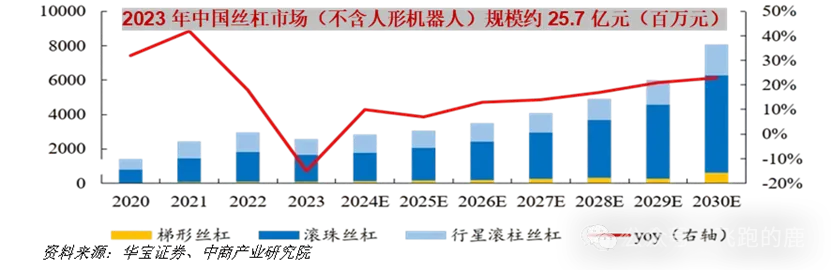 2023年的时候,国内丝杆的市场总值为25.7亿人民币,当中滚珠丝杆所占比例为61%,梯形丝杆的占比是35%,行星滚柱丝杆的占比为4%。两者之中的后者,由于运用了多螺纹滚柱这一结构,承载能力得以显著地提升,代表着高端技术的路线。当下在全球范围之内,仅仅只有德国的舍弗勒以及中国的新剑传动这两家企业,为特斯拉Optimus提供货物。