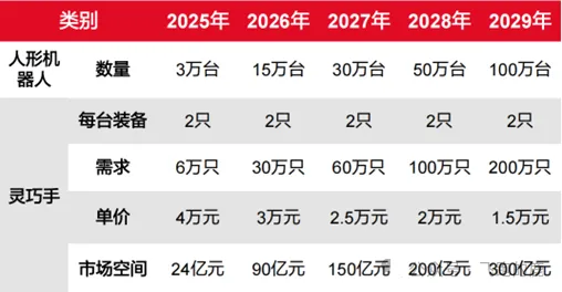 预计在2029年,全球人形机器人的产量达到100万台,需要配备200万只灵巧的手。规模化生产达成之后,单只成本存有希望降低到1.5万元,与之相对应的市场规模大概是300亿元。