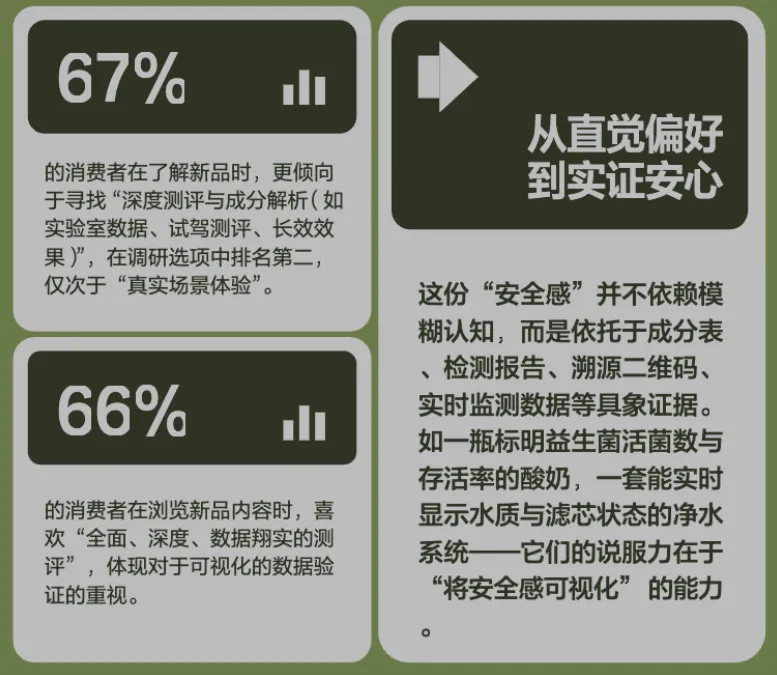 • 安心具象化:「大概」安心正在失效,取而代之的是看得见的安心,用户对「透明化事实」提出要求,具体可验证的数据、流程、信息成为信任依据。