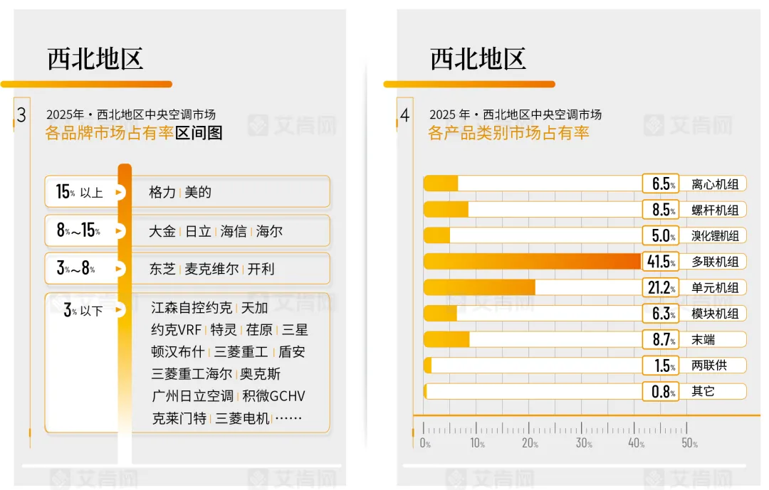 产品方面,作为西北市场长期以来的主力,2025年多联机的市场份额出现显著下滑,直接印证了其主攻的房地产配套、中小型公建及家装零售市场遭受的全面打击,市场竞争的惨烈在该品类中表现最为集中。
