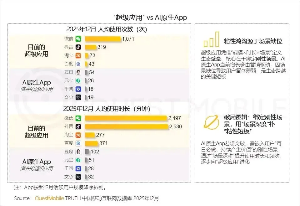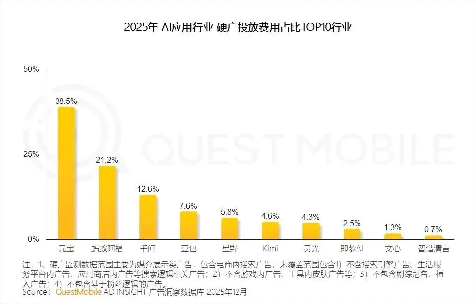 2026年2月的AI应用榜单,字节豆包月活3.15亿,直接登顶;而腾讯的“元宝”,月活只有1.09亿,连前五都没进。要知道,元宝的广告投放费用,比蚂蚁、千问加起来还多,可就是换不来用户。