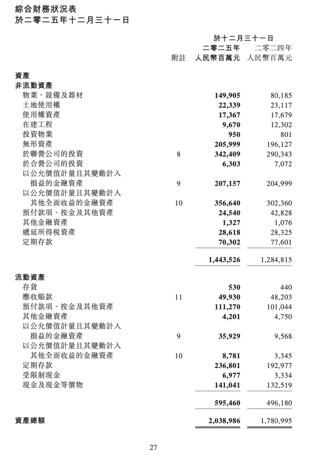 “于联营公司的投资”属于非流动资产中的“长期股权投资”。什么叫长期股权投资?就是腾讯买下了一些公司的股份,并且对这些公司能施加“重大影响”,或者和别人共同控制这些公司。既然是联营公司,腾讯不会打算明天就把它们的股票卖了套现,而是选择长期共同发展。在财报第41页的 “综合财务报表附注8”可以看到这3424.09亿元中,有1827.57亿元投给了上市企业,1596.52亿元投给了非上市企业。腾讯作为股东,每年会根据这些联营公司赚了多少钱或亏了多少钱,按比例算进自己的利润表里(这在财报上叫“分占联营公司及合营公司盈利净额”)。由于它是一个非常核心的利润指标,我们在财报好几个重要位置都能看到它,其中一个就是25页的“综合收益表”(即利润表)中,可以直接看到“分占联营公司及合营公司盈利╱(亏损)净额”这一项,2025年记入利润表的金额为237.4亿元。