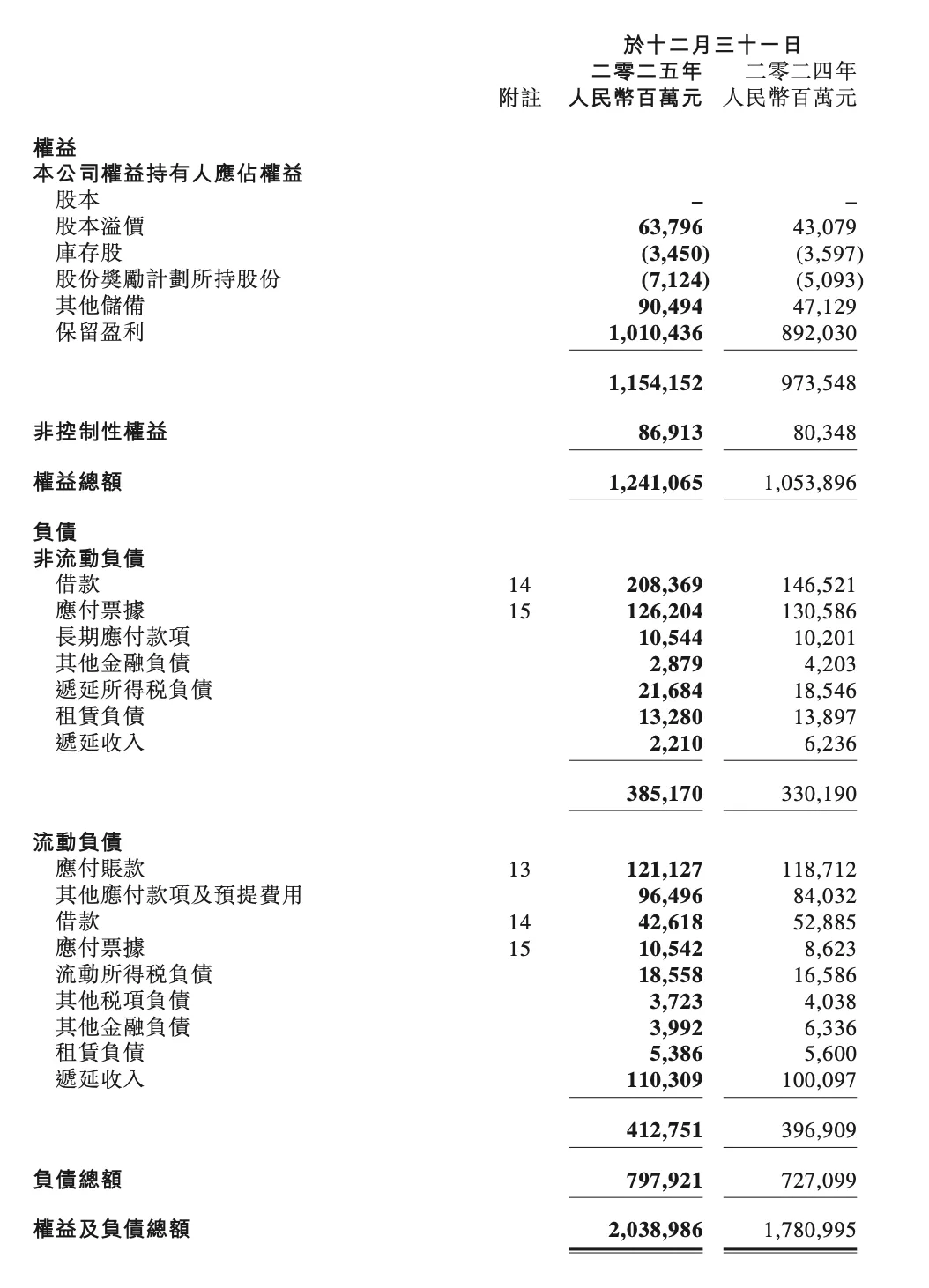 从腾讯的资产中,我们能看到钱的去向。有些很快能变现(如货币资金、应收账款、存货等流动资产),有些需要漫长的时间来消耗(如机器设备、厂房、土地等非流动资产)。截至2025年底,腾讯的总资产高达约20389.86亿元人民币。腾讯账上的“现金及现金等价物”有1410.41亿元,加上定期存款等,手头能动用的资金极其充裕。更让人惊叹的是它的非流动资产,其中“于联营公司的投资”高达3424.09亿元,“以公允价值计量且其变动计入其他全面收益的金融资产”高达3566.4亿元。这说明什么?说明腾讯不仅仅是一家互联网科技公司,它的资产结构透露出它还是一个无比庞大的“投资帝国”。