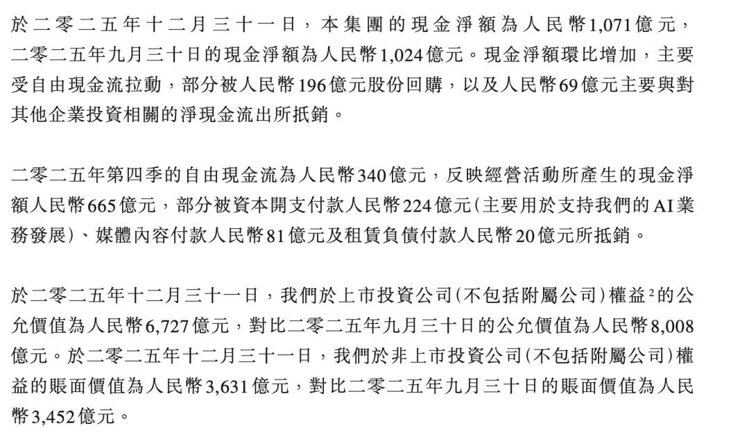 净流出871.55亿元。融资活动流出意味着什么?意味着腾讯赚了钱后,会给股东分红、偿还债务或者回购股票。财报显示,腾讯在2025年狂砸约800亿港元在市场上回购并注销了自己的股票,同时还拿出了大笔现金派发股息。这是一家既有钱,又愿意慷慨回报股东的公司。